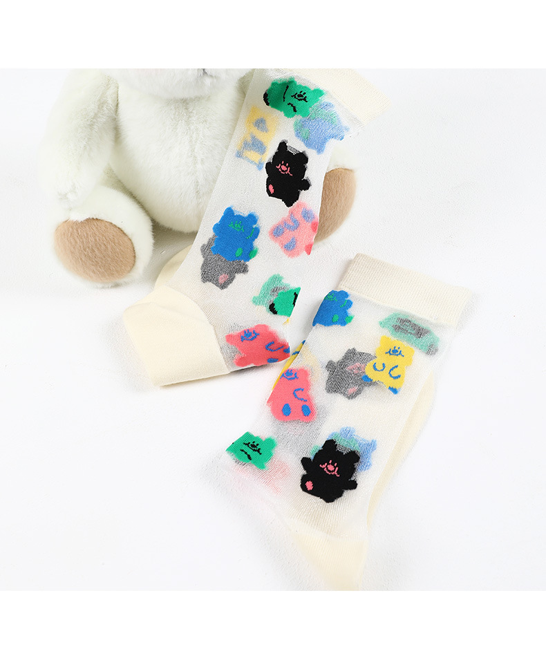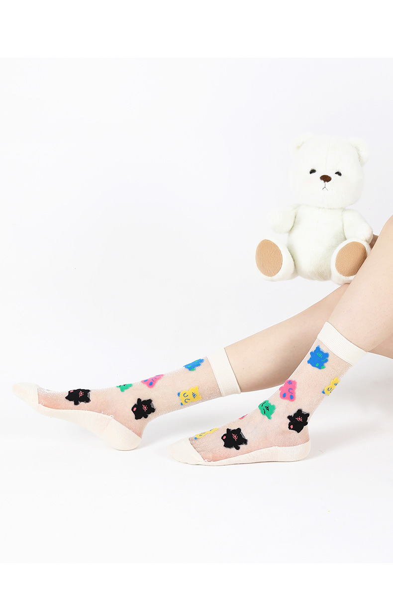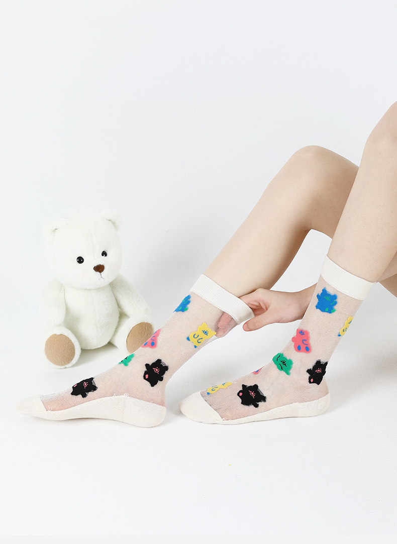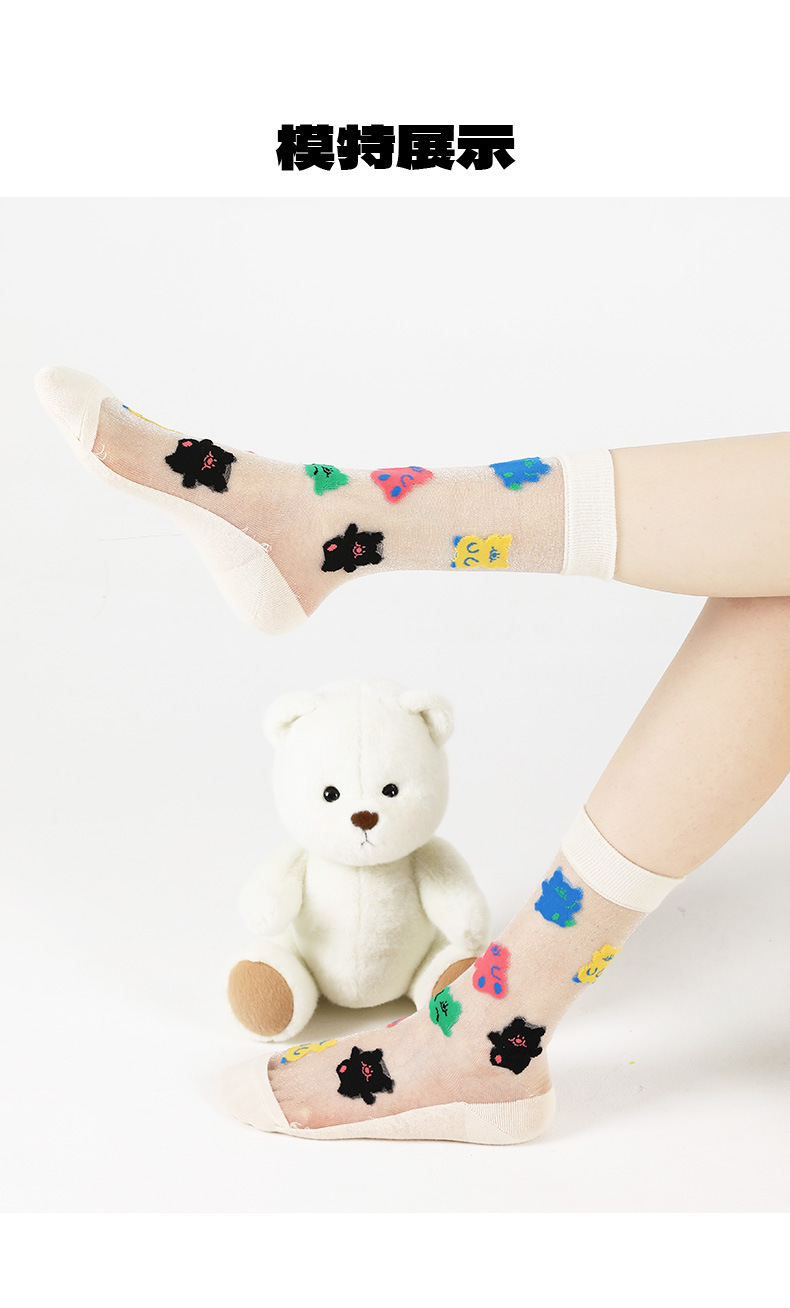 DAMAHOOV 오리지널 만화 일러스트 양말 여성용 여름 초박형 귀여운 곰 중간 길이 양말 유리 실크 면 양말스토어 가기