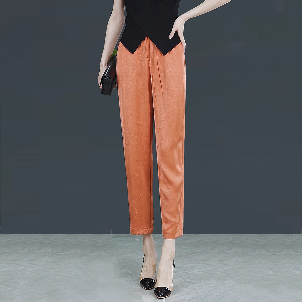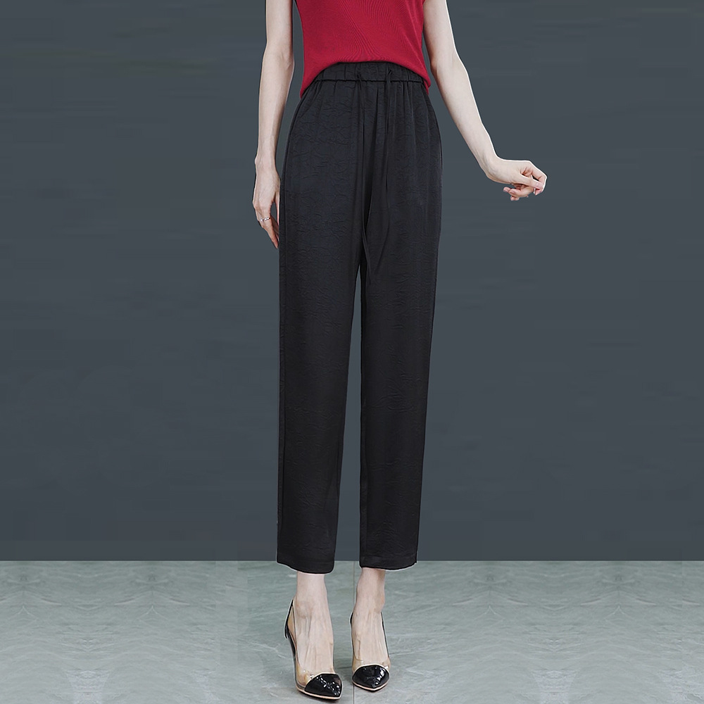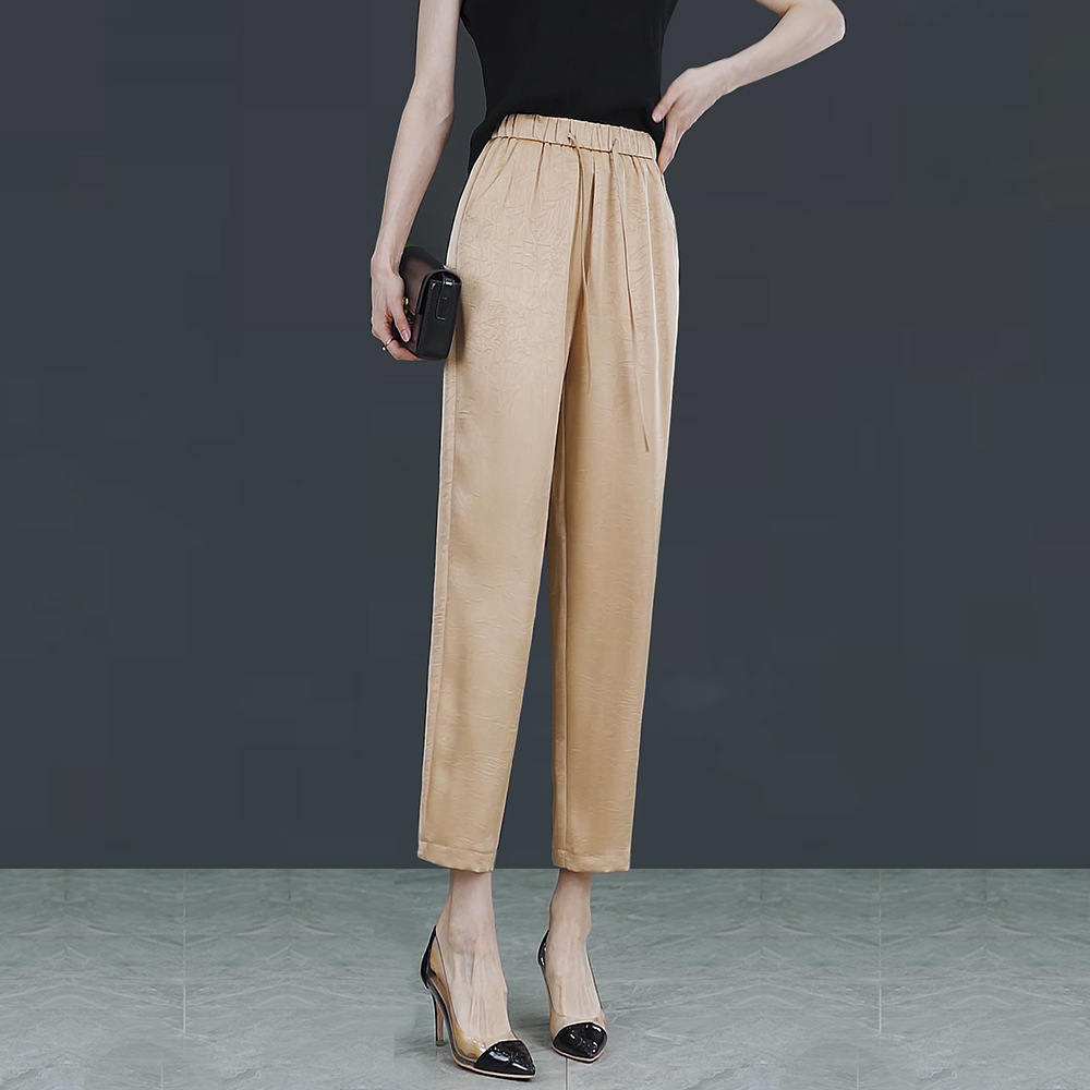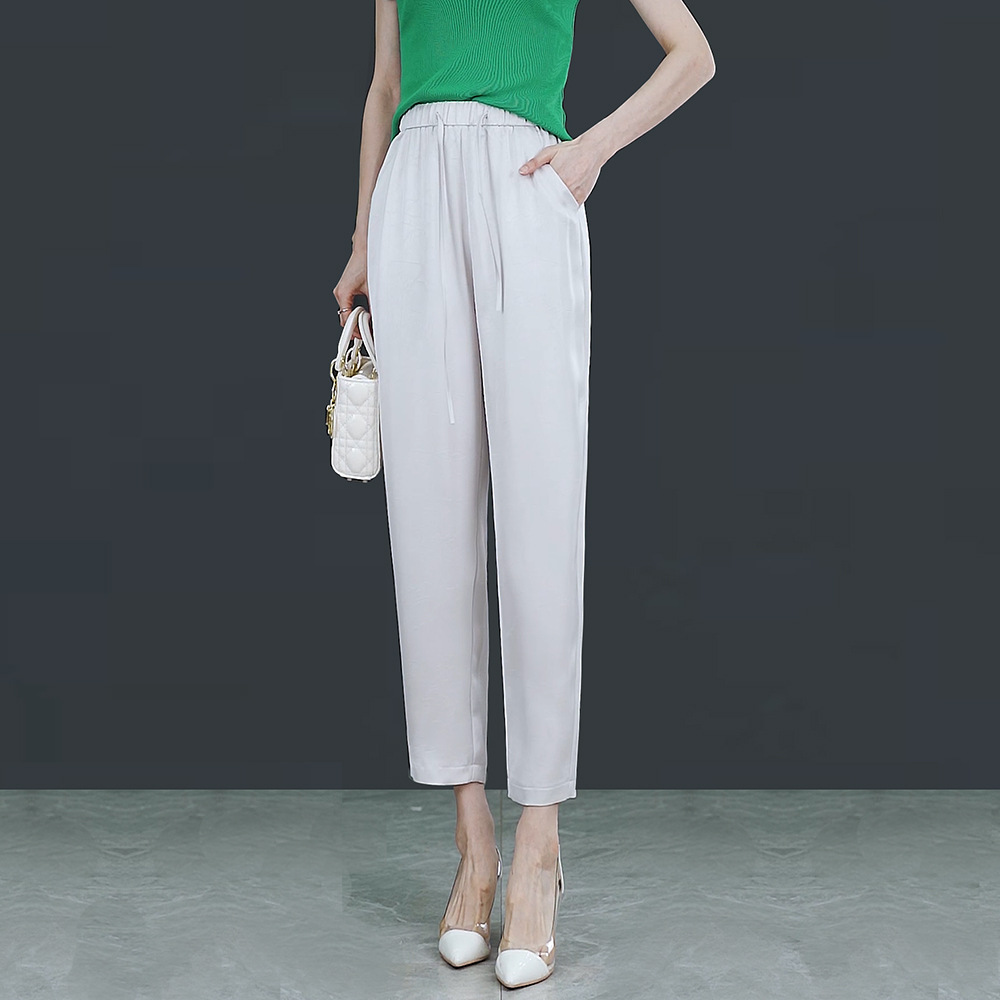 아이스 실크 하이 웨이스트 캐주얼 발목 길이 바지 얇은 2023 여름 새틴 슬리밍 드레이핑 모든 경기 양각 다리 하렌 바지