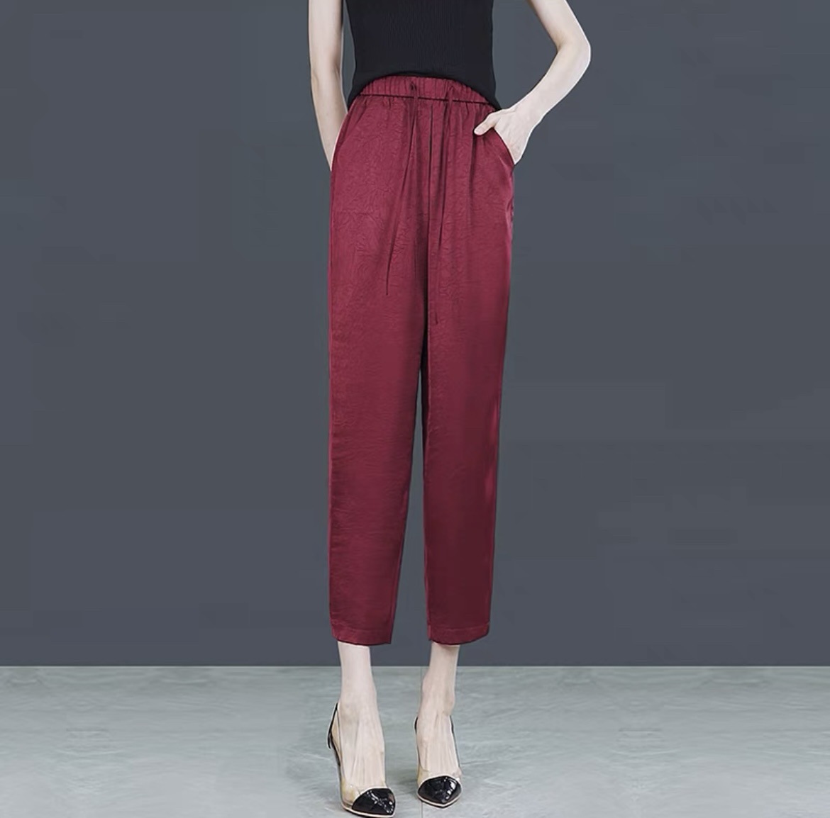 아이스 실크 하이 웨이스트 캐주얼 발목 길이 바지 얇은 2023 여름 새틴 슬리밍 드레이핑 모든 경기 양각 다리 하렌 바지스토어 가기