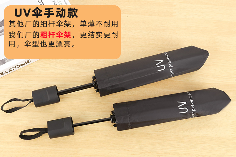 我们厂生产的这款黑胶UV伞手动款采用“加粗杆伞架”,更结实更耐用,伞型也更漂亮。