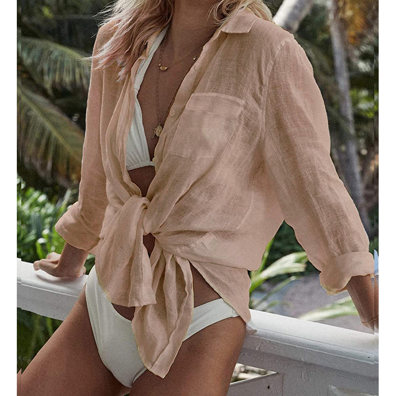구미 국경 해외 무역 아마존 느슨한 레저 휴가 비치 블라우스 주름 천 비키니 선 스크린 셔츠