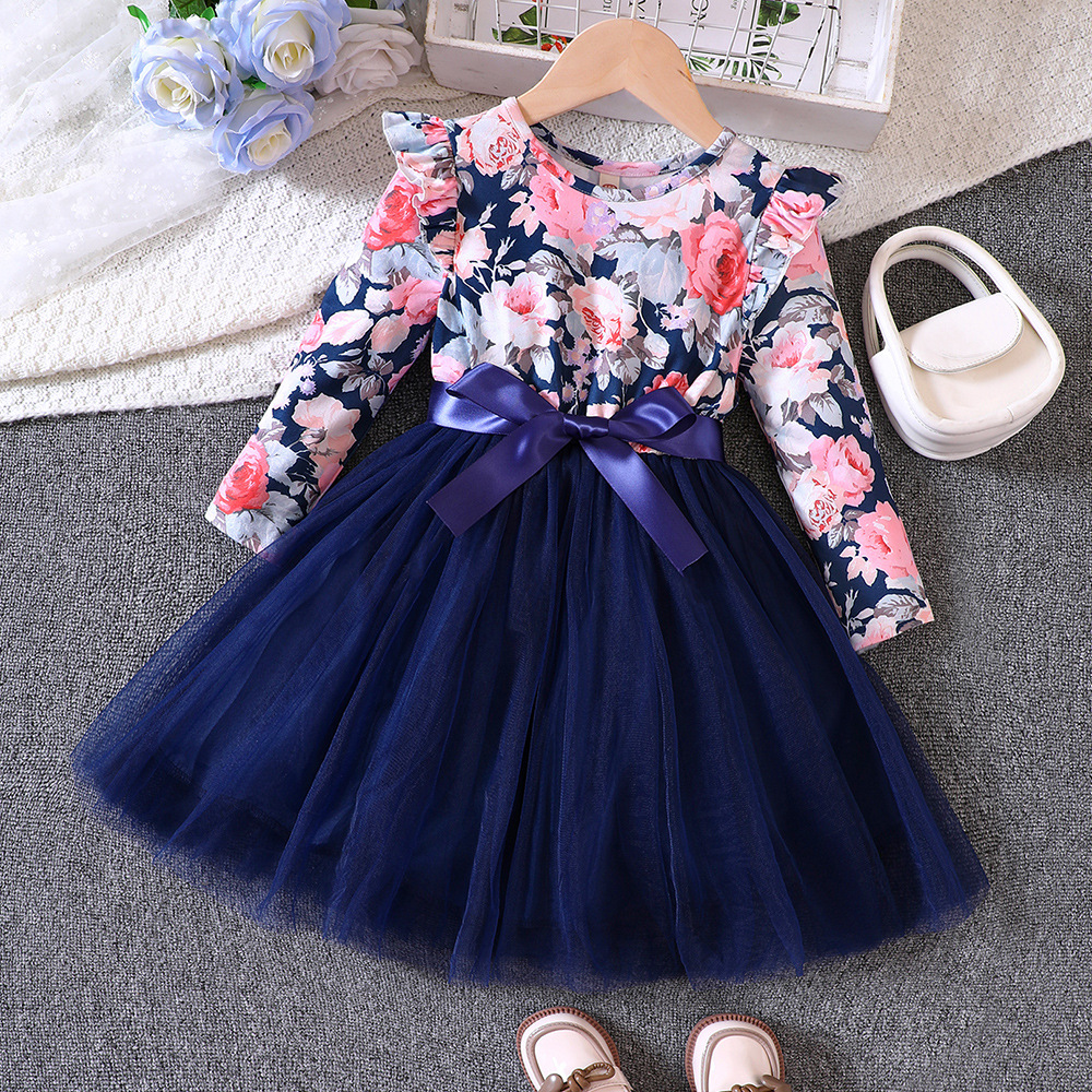 EW 대외 무역 아동복 중소 규모 아동의 새로운 소녀 봄과 가을 비행 소매 긴 소매 인쇄 메쉬 원피스 Q1409-A