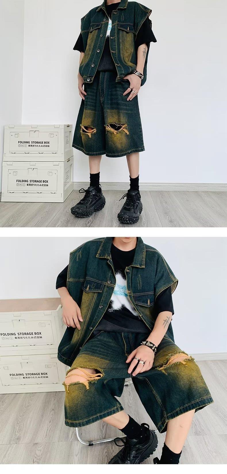 아메리칸 스타일 빈티지 씻어 오래 된 폐기물 지구 스타일 데님 조끼 반바지 세트 남자의 여름 디자인 감각 배열 세트