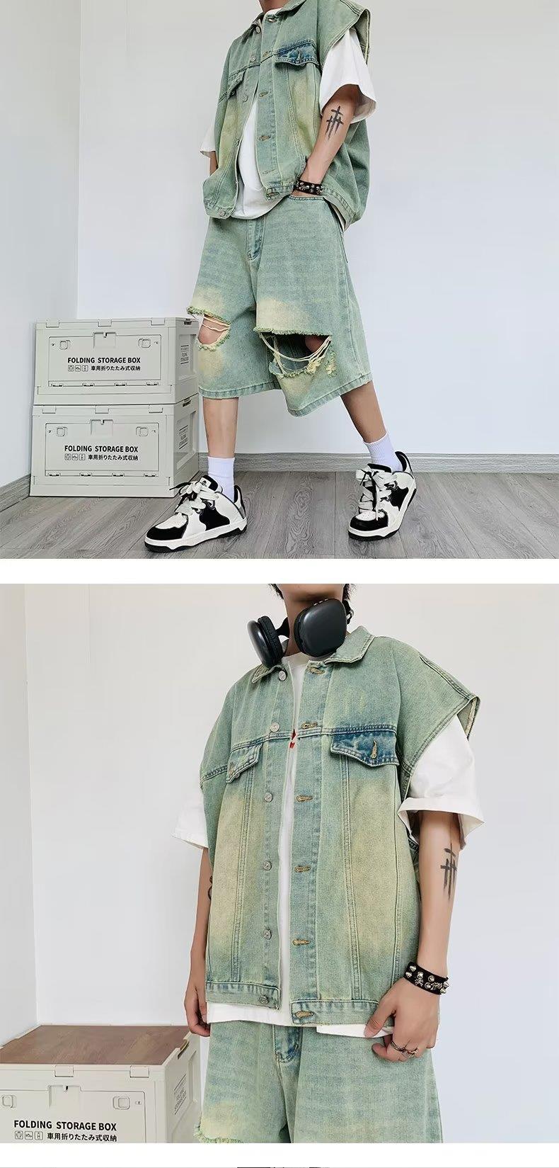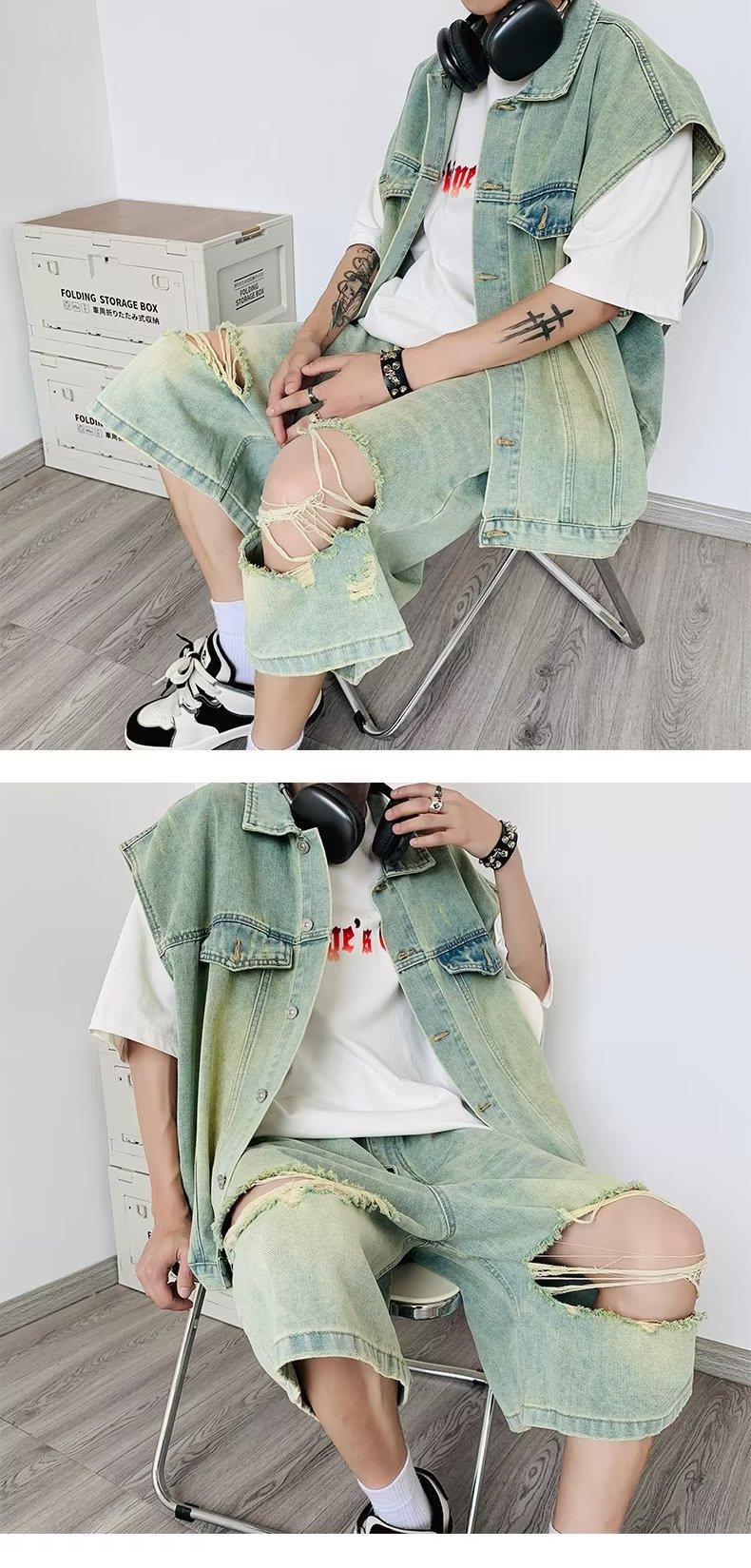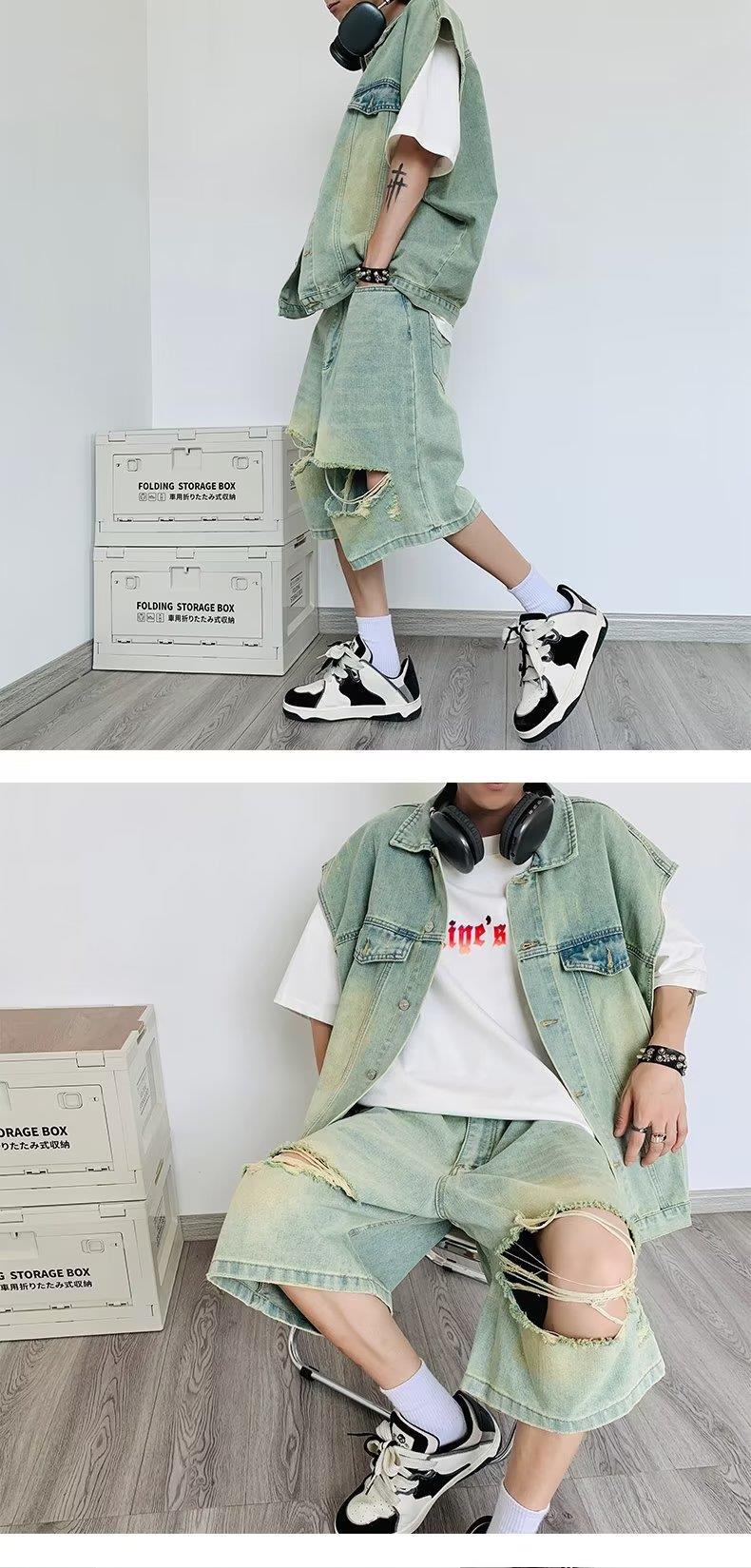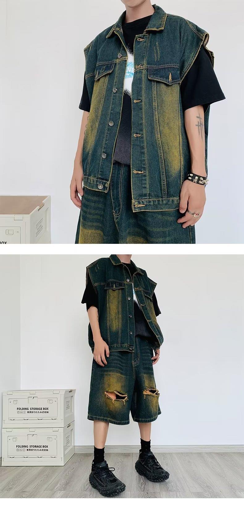 아메리칸 스타일 빈티지 씻어 오래 된 폐기물 지구 스타일 데님 조끼 반바지 세트 남자의 여름 디자인 감각 배열 세트스토어 가기