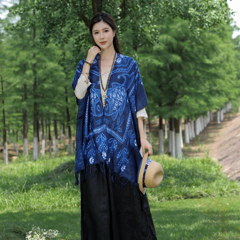 새로운 에스닉 스타일 블루 염료 긴 술 스카프 여성용 윈난 관광 장식 가디건 여름 자외선 차단제 숄
