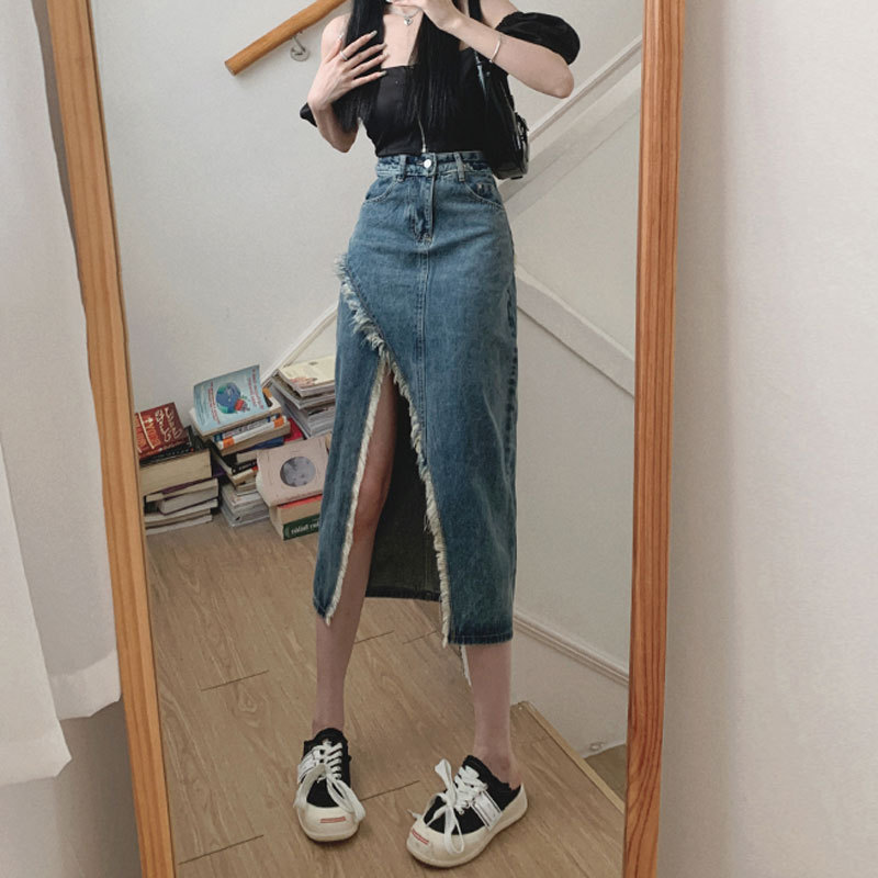 랩 데님 스커트 여성의 유행 불규칙한 스플릿 하이 웨이스트 향신료 소녀 A-라인 복고풍 고기 커버 엉덩이 반 길이 스커트스토어 가기