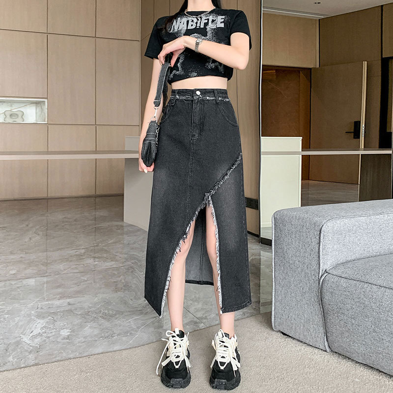랩 데님 스커트 여성의 유행 불규칙한 스플릿 하이 웨이스트 향신료 소녀 A-라인 복고풍 고기 커버 엉덩이 반 길이 스커트