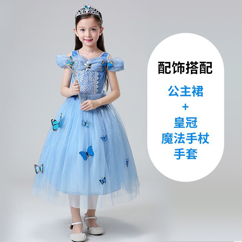 • 블루 프린세스 원피스 짧은 소매 크라운 + 매직 지팡이 + 나비 + 장갑