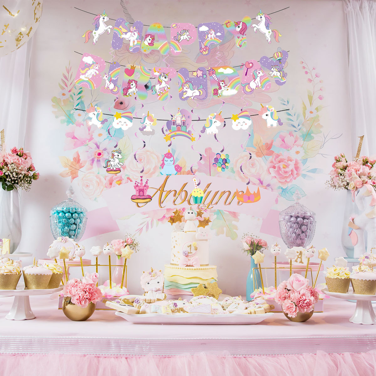 새로운 만화 유니콘 파티 용품 세트 행복한 생일 편지 깃발 어린이 생일 장식