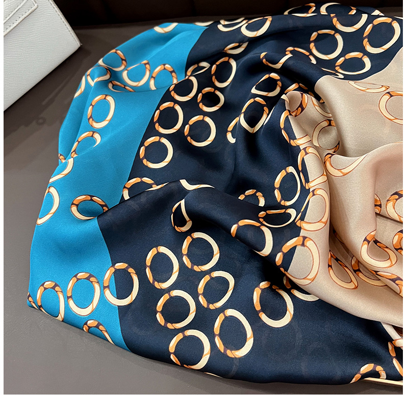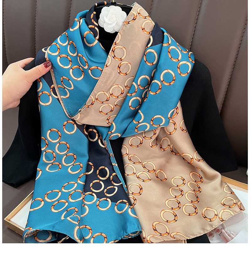 라이트 럭셔리 메탈 링 블루 대형 롱 스카프 고급 자외선 차단제 롱 프린트 실크 스카프 모조 롱 스카프