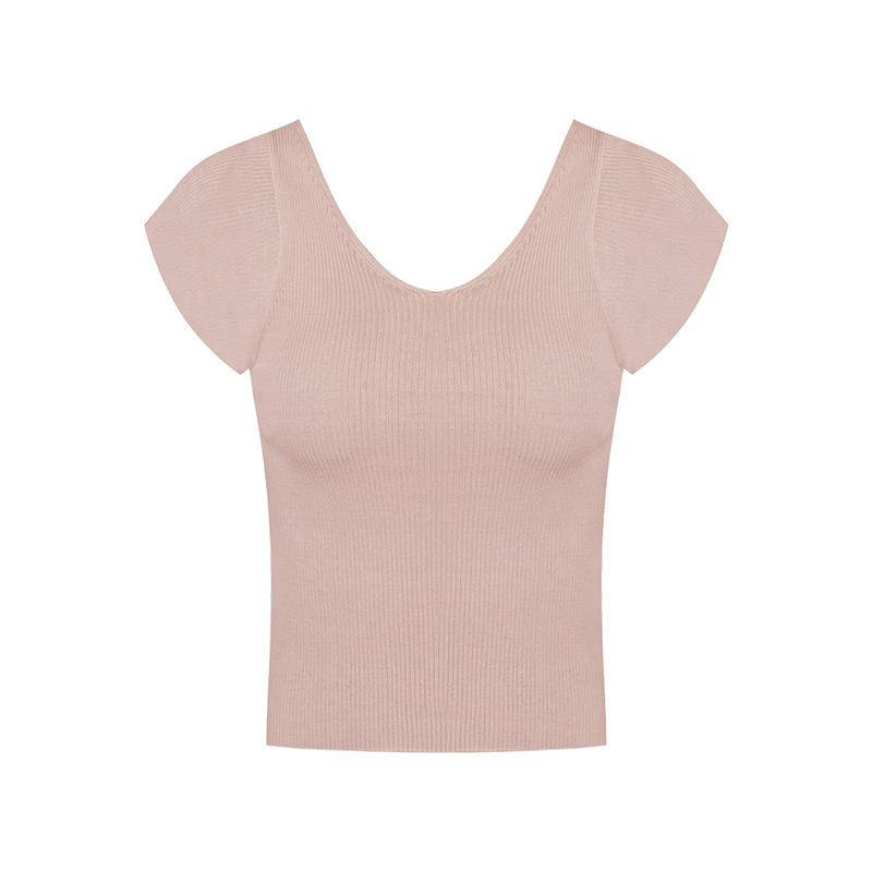 복숭아 여자 친구 텐셀 뽕나무 실크 작은 비행 소매 니트 ~ V 칼라 풀오버 짧은 소매 T 여성 여름