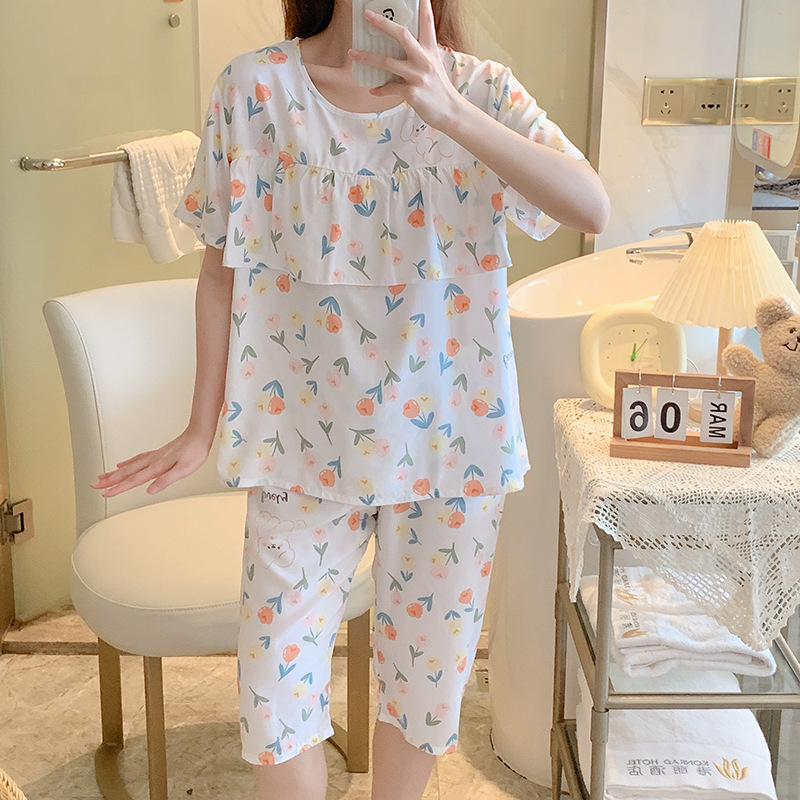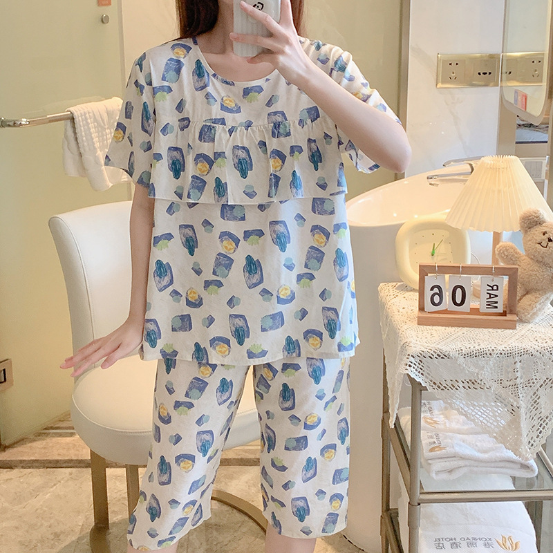 면 실크 여성용 잠옷 얇은 반팔 플러스 사이즈 세트 여름 달콤한 귀여운 인쇄 편안한 겉옷 가정 옷스토어 가기