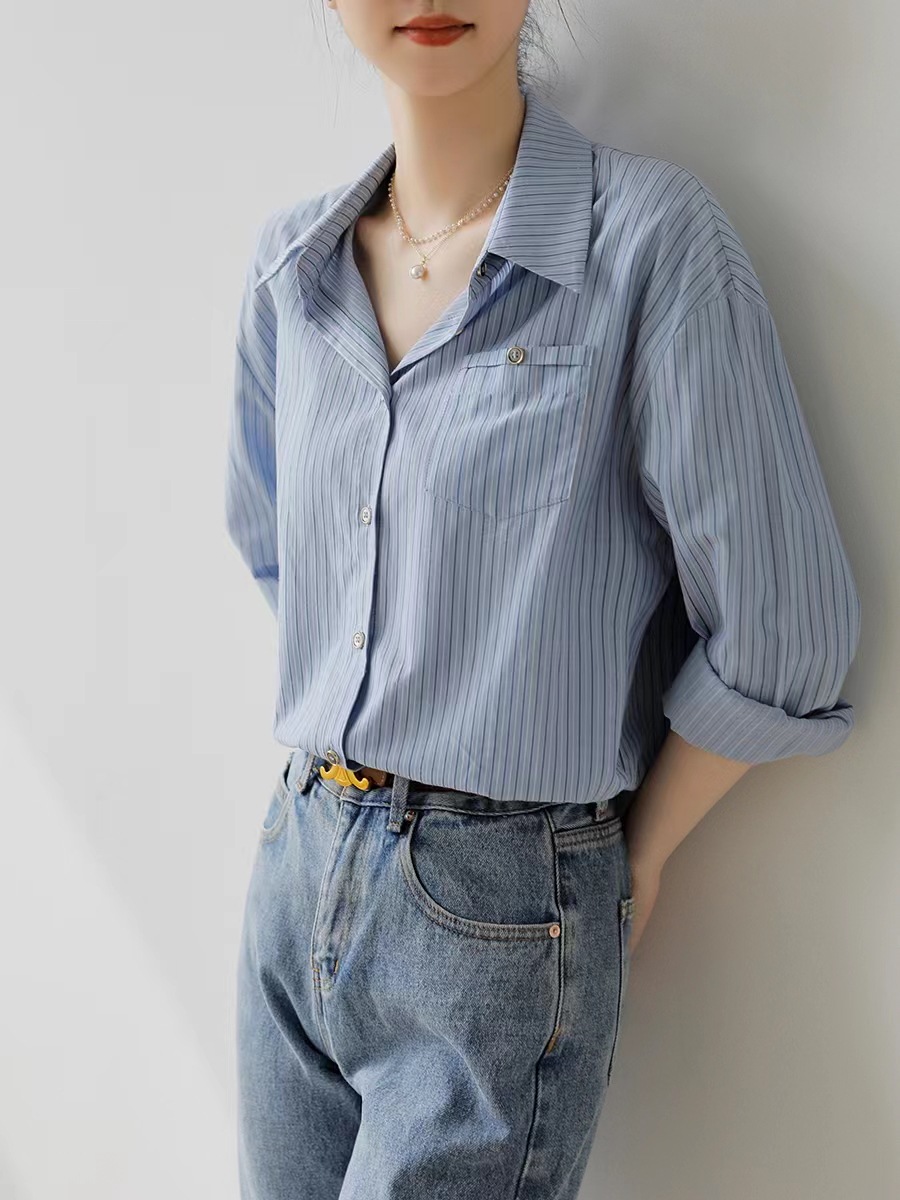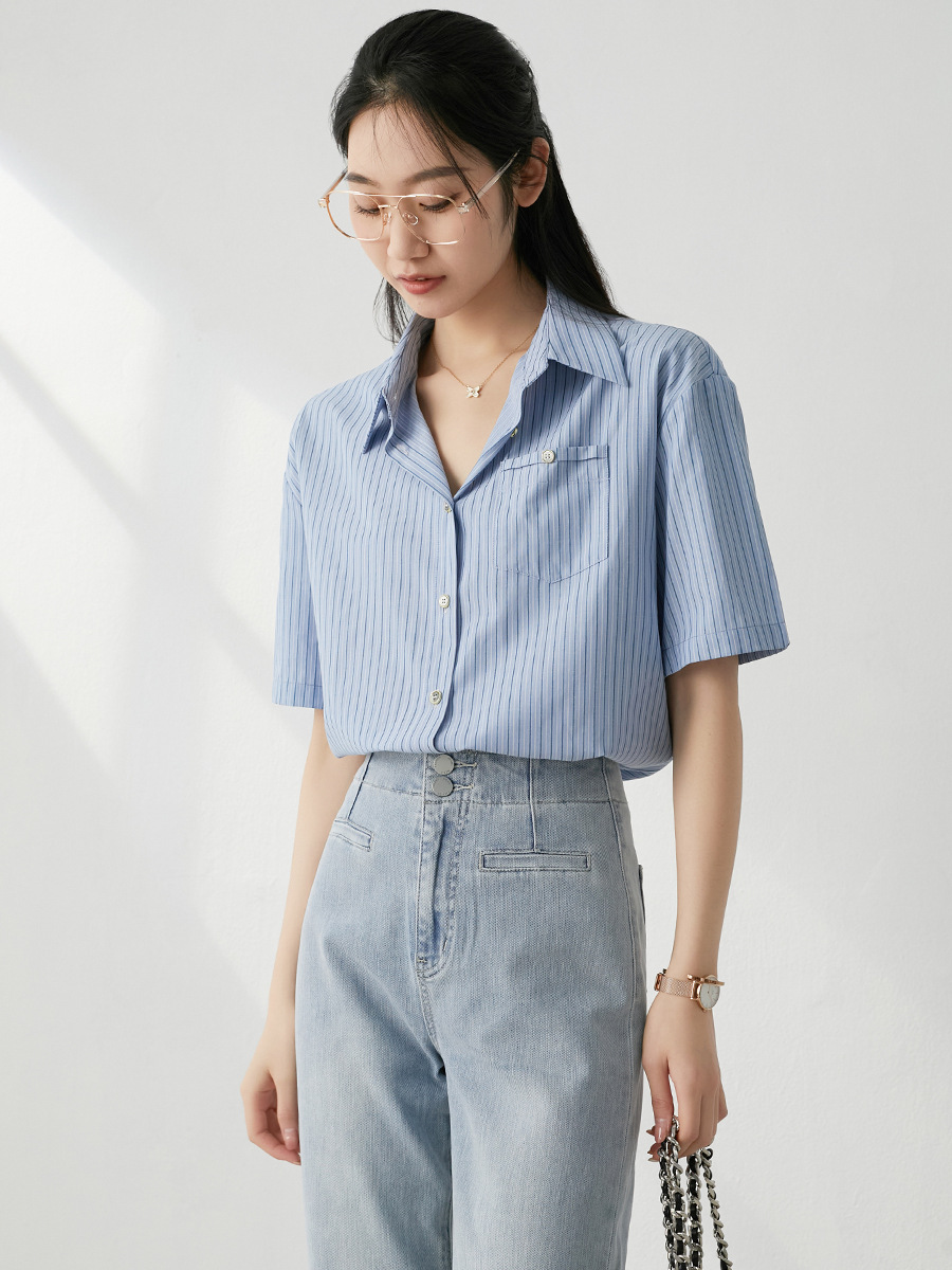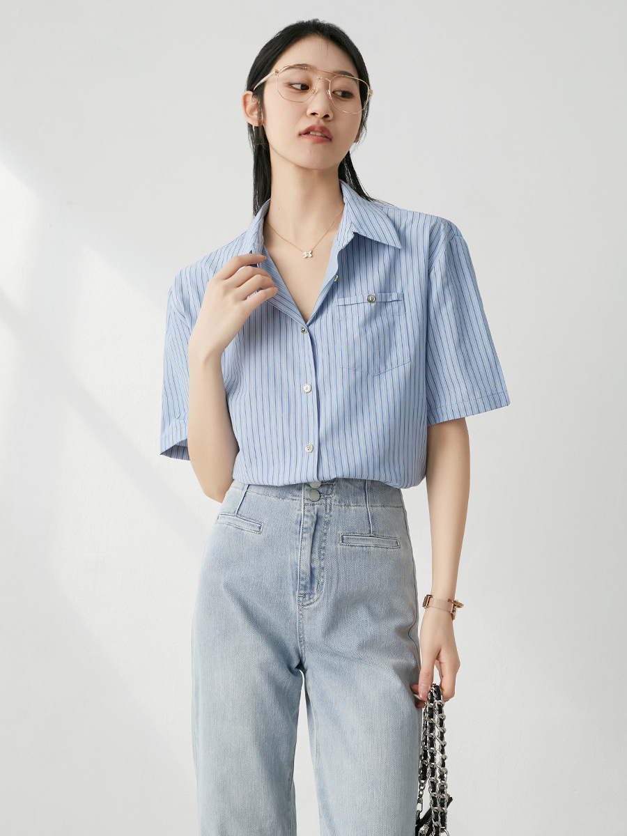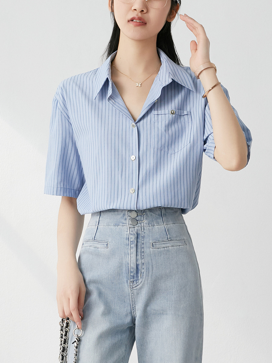 홍콩 스타일 블루 스트라이프 반팔 셔츠 여성용 여름 새로운 레트로 루즈한 모든 매치 통근 디자인 틈새 셔츠스토어 가기