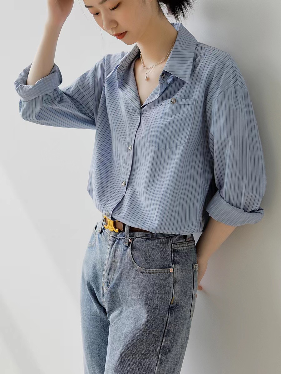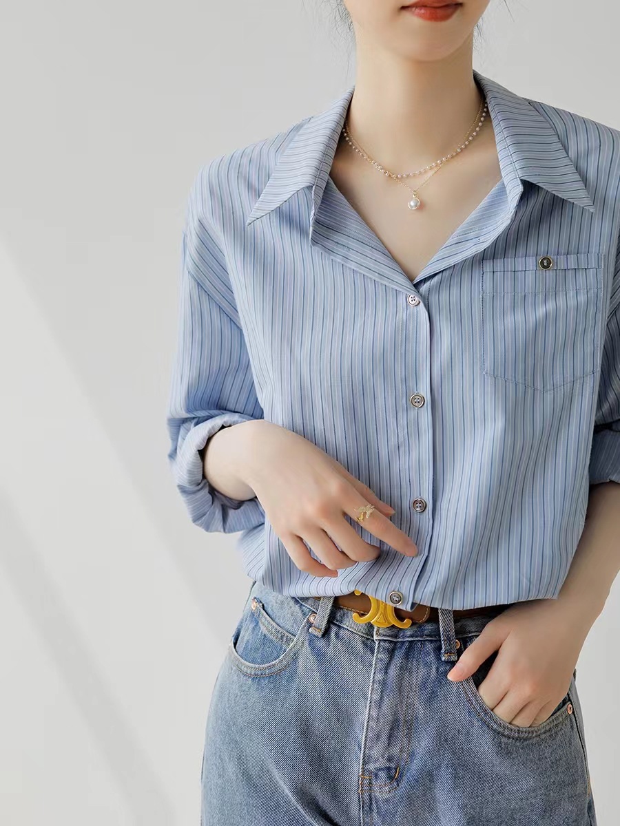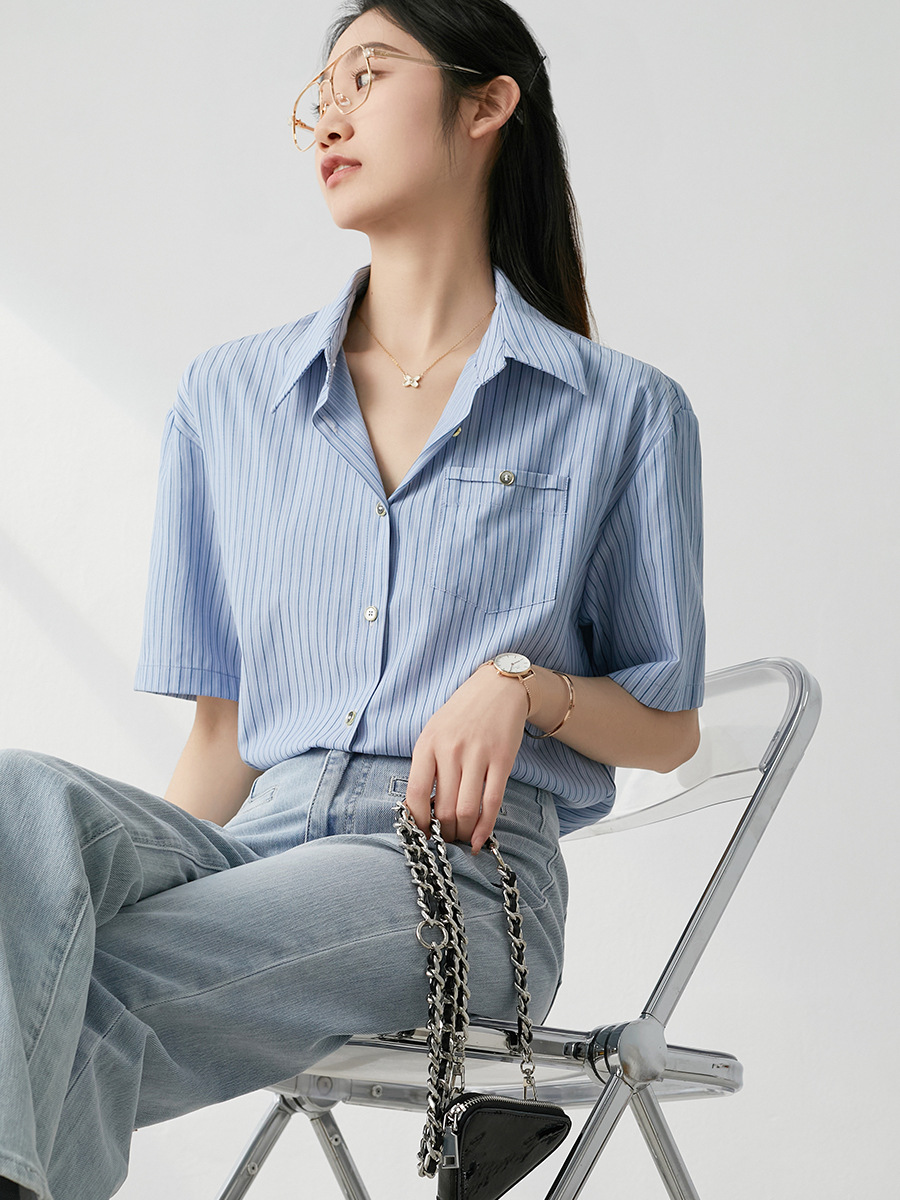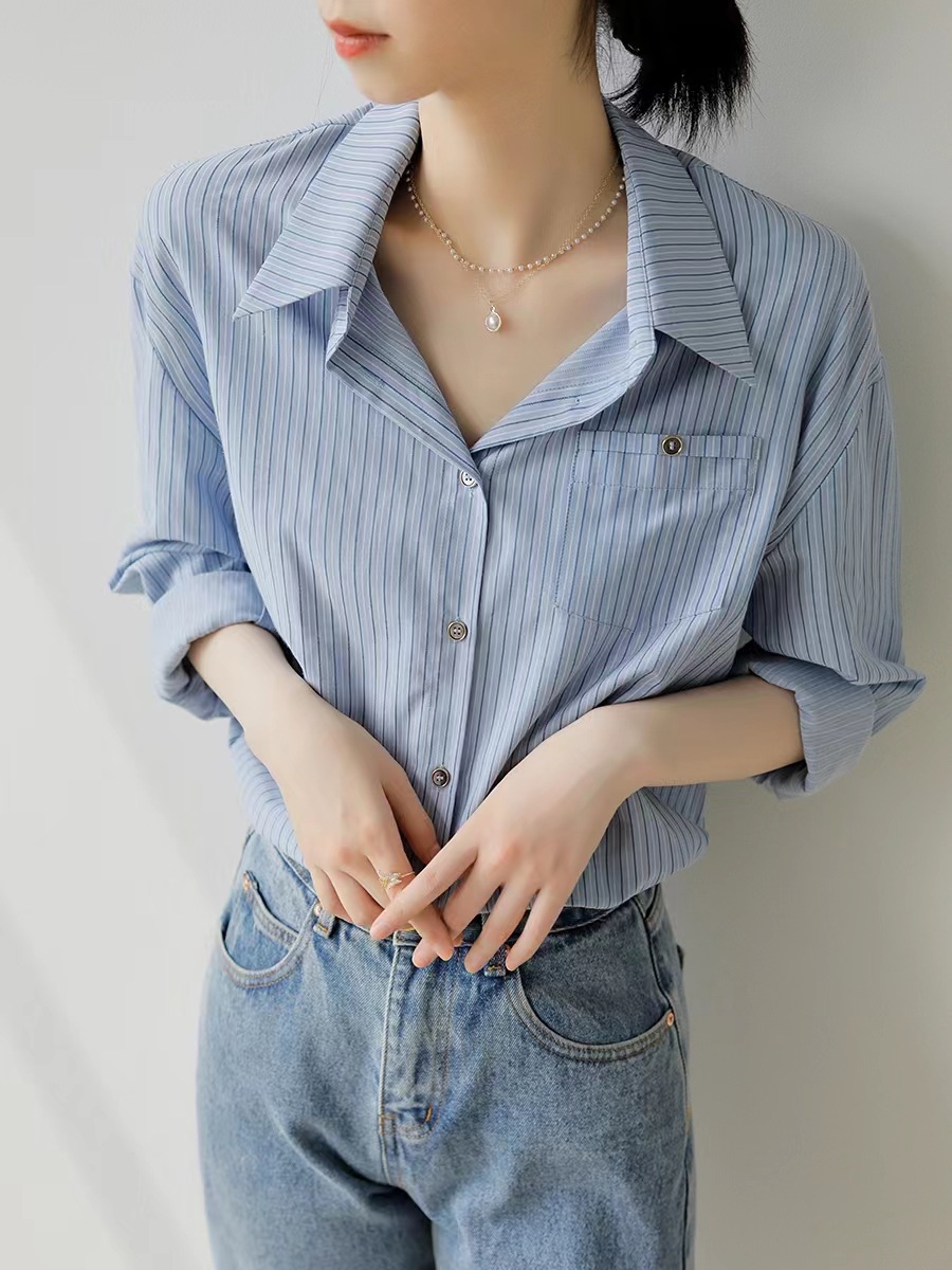 홍콩 스타일 블루 스트라이프 반팔 셔츠 여성용 여름 새로운 레트로 루즈한 모든 매치 통근 디자인 틈새 셔츠스토어 가기