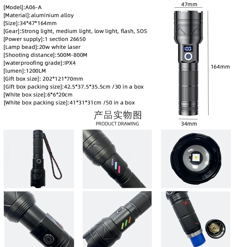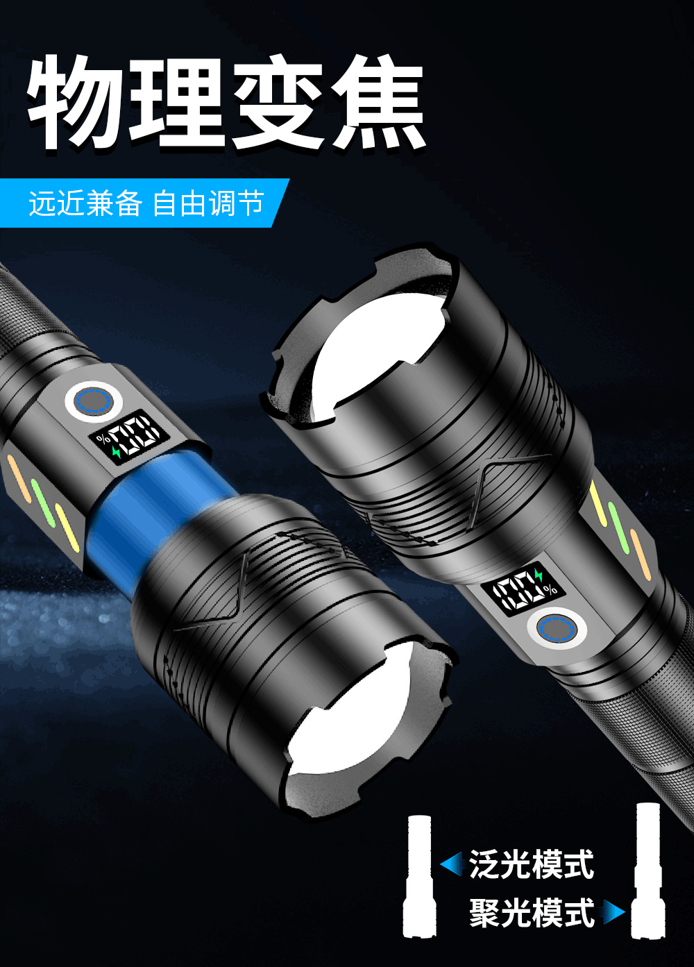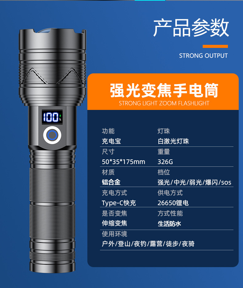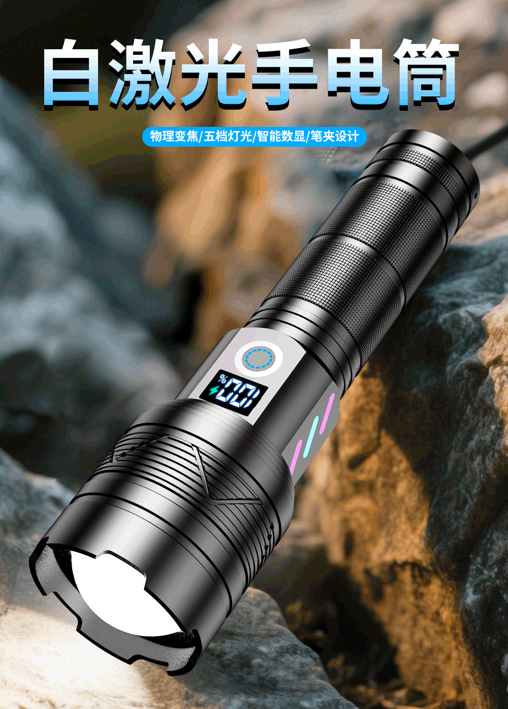 국경 다기능 전술 손전등 강한 빛 레이저 총 야외 줌 디지털 디스플레이 충전 20W 백색 레이저 손전등