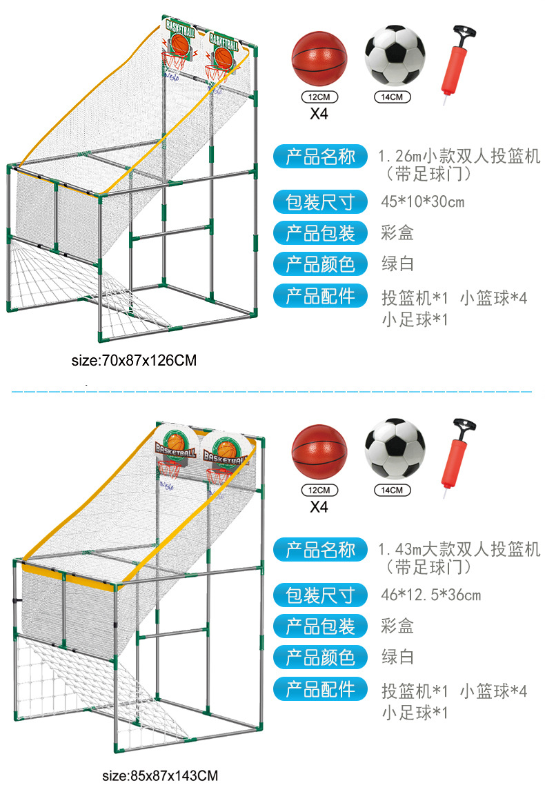 • 축구 게이트 + 공 2 개 (12cm) 가있는 1.26m 소형 더블 농구 기계