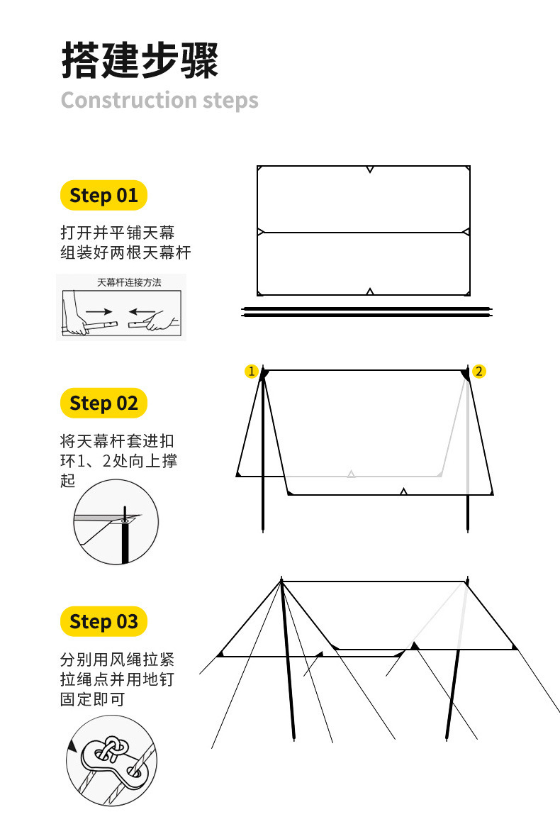 • 완전 암막 비닐 캐노피 [플래그십 에디션]에는 해머 + 25개의 튜브 폴 + 알루미늄 버클 반사 로프 + 형광 못이 함께 제공됩니다.