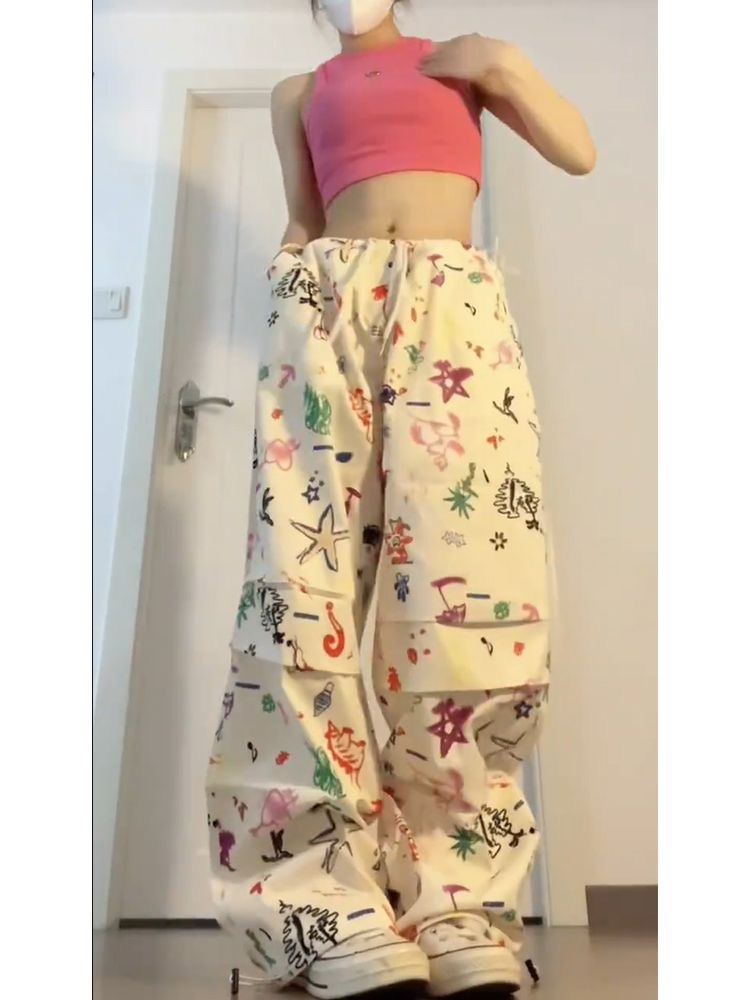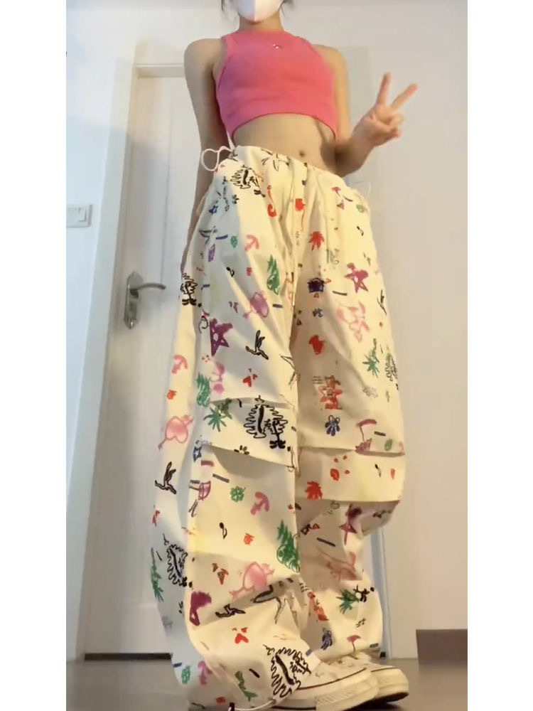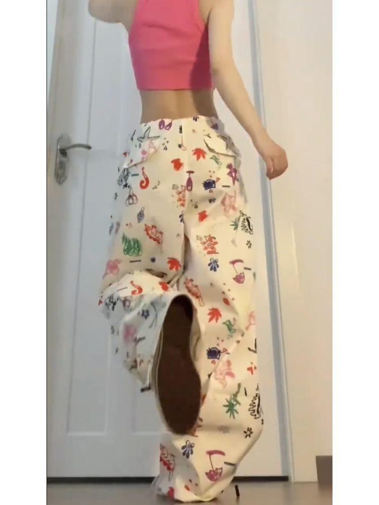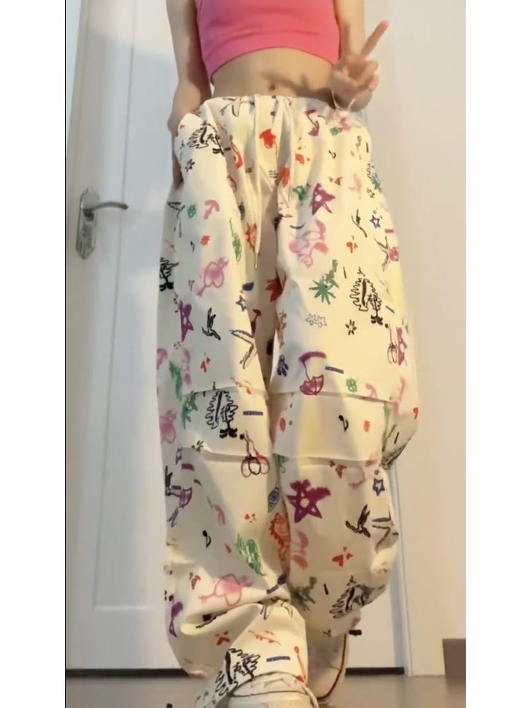 여름 하이 웨이스트 슬리밍 미국 복고풍 힙합 재미 낙서 전체 인쇄 작업 바지 여성의 느슨한 다리 바지