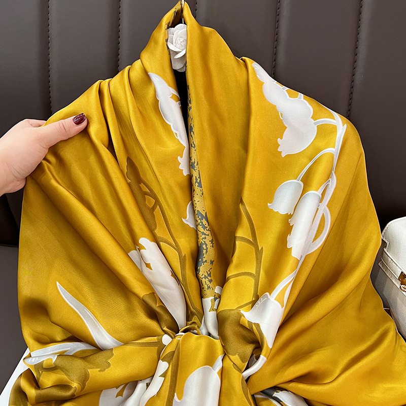 한국 스타일 라이트 럭셔리 팰리스 스타일 실크 스카프 여성용 모든 매치 봄과 여름 세련된 바람 벨 플라워 스카프 외부 이중 사용 긴 스카프