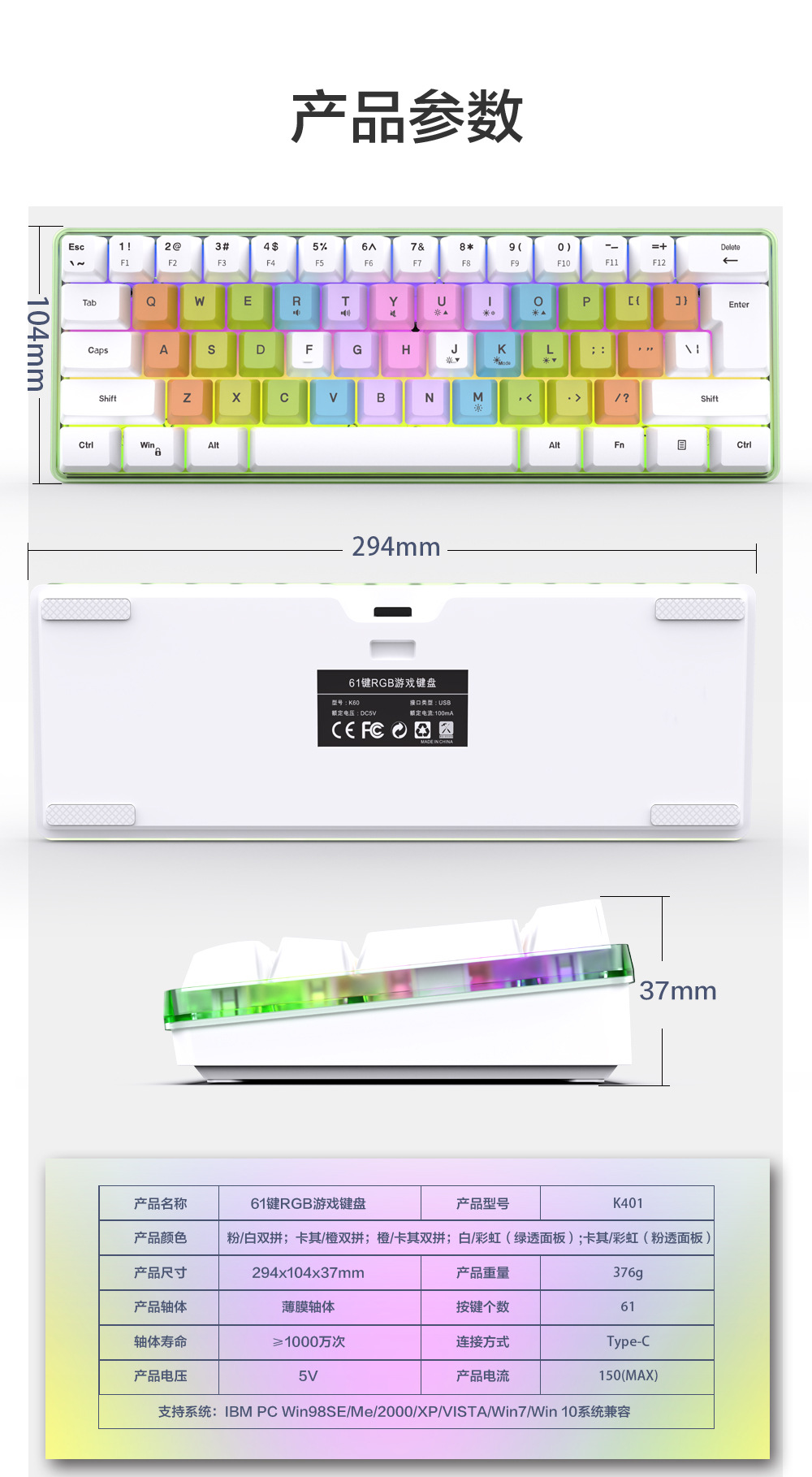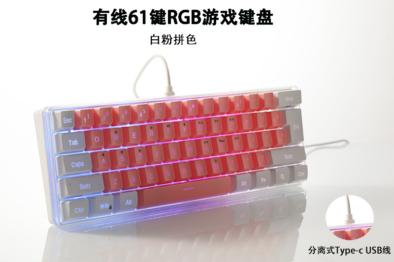 국경을 넘는 재고 61키 K401 컬러블록 RGB 커스텀 컬러 기계식 느낌 키보드, 유선 분리형 USB 게이밍 키보드