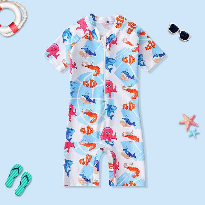 어린이 수영복 남아 여아 원피스 반팔 수영복 소형, 중형 및 대형 어린이 유행 만화 통기성 속건 온천 수영복