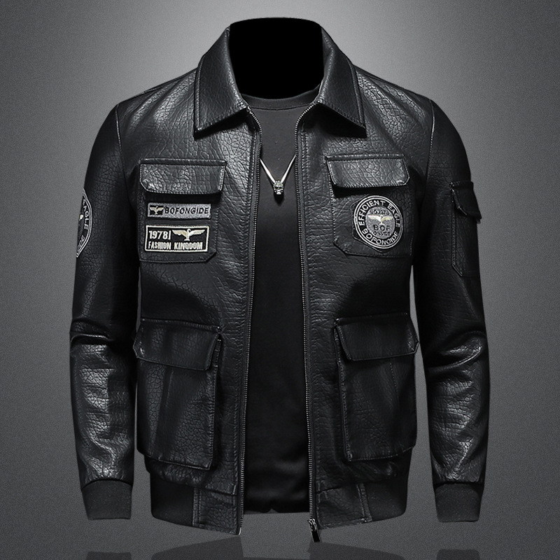 2023 봄과 가을 새로운 밀리터리 스타일 에비에이터 가죽 자켓 남성용 플러스 사이즈 슬림핏 라펠 자수 남성용 가죽 자켓