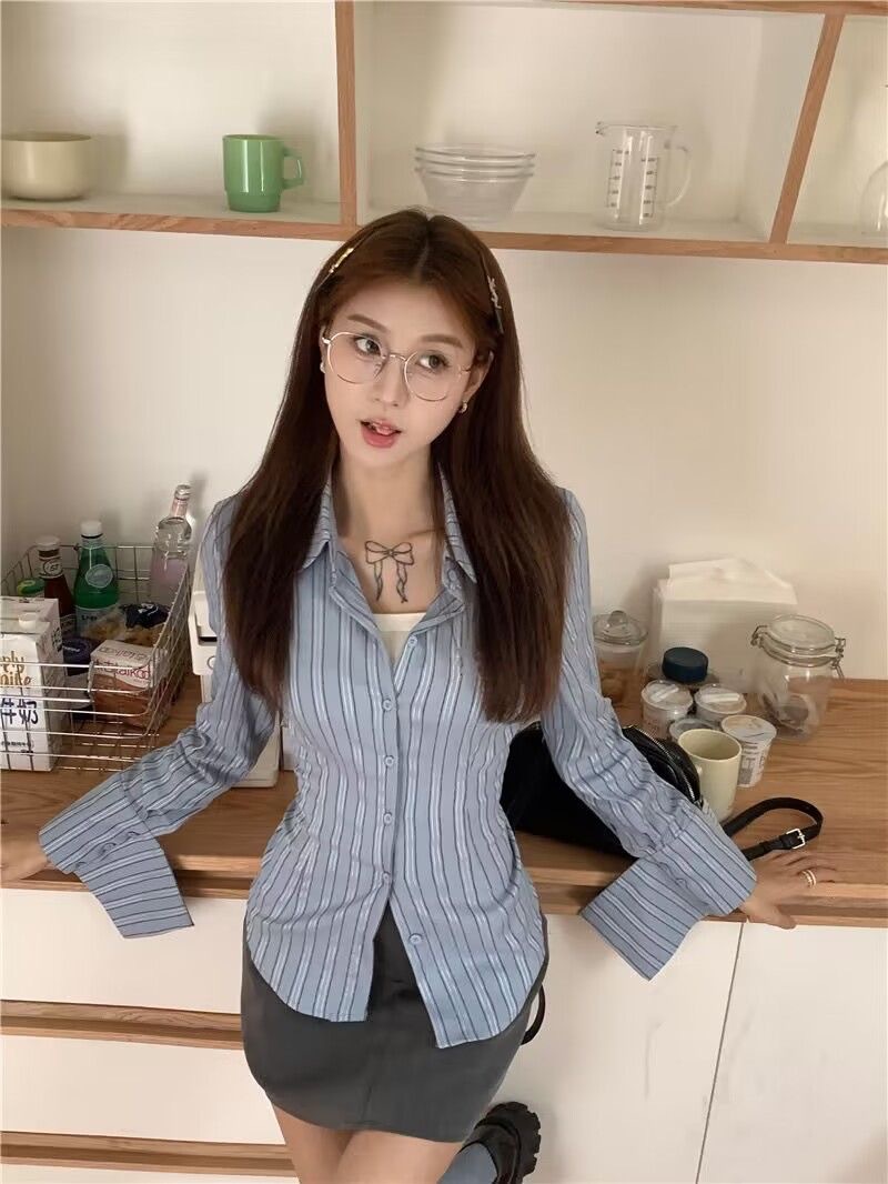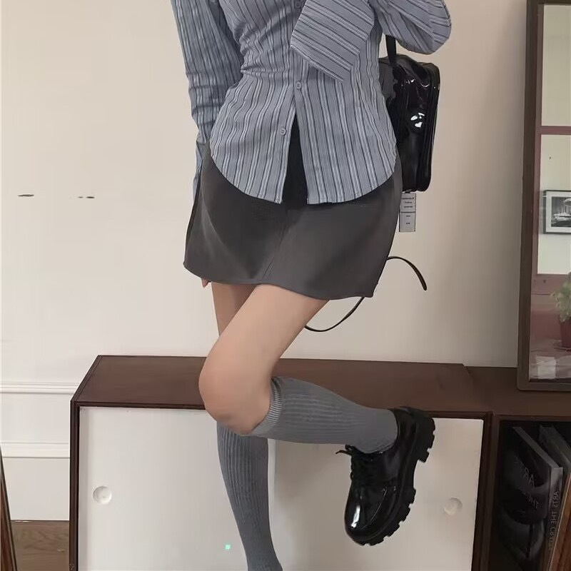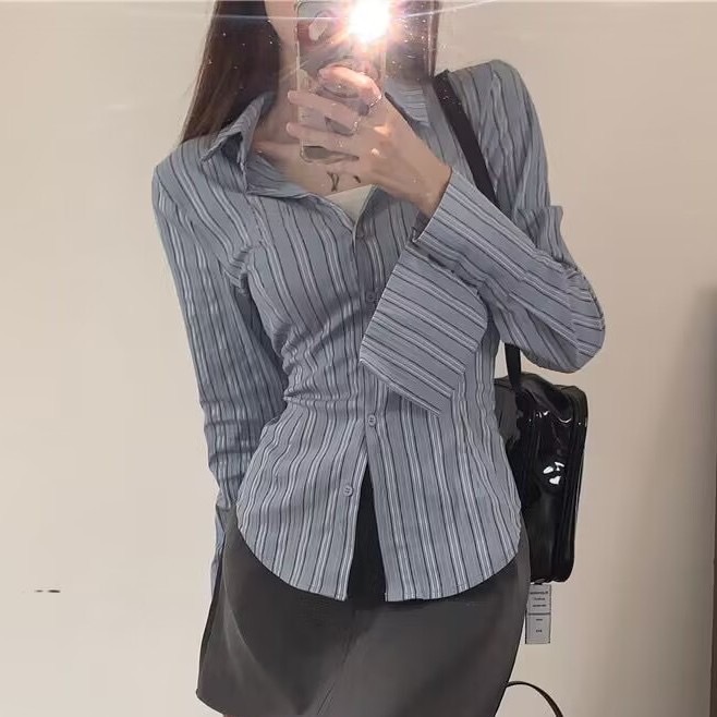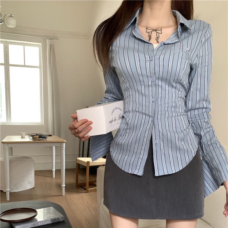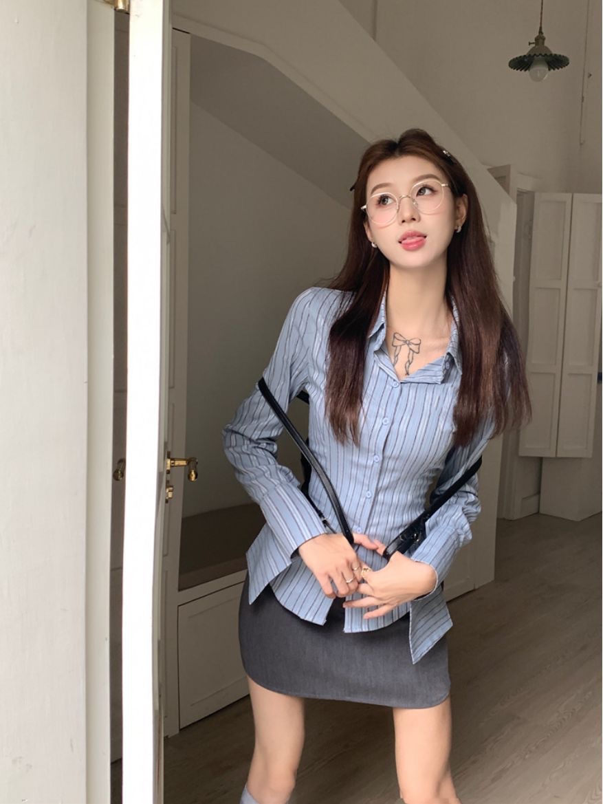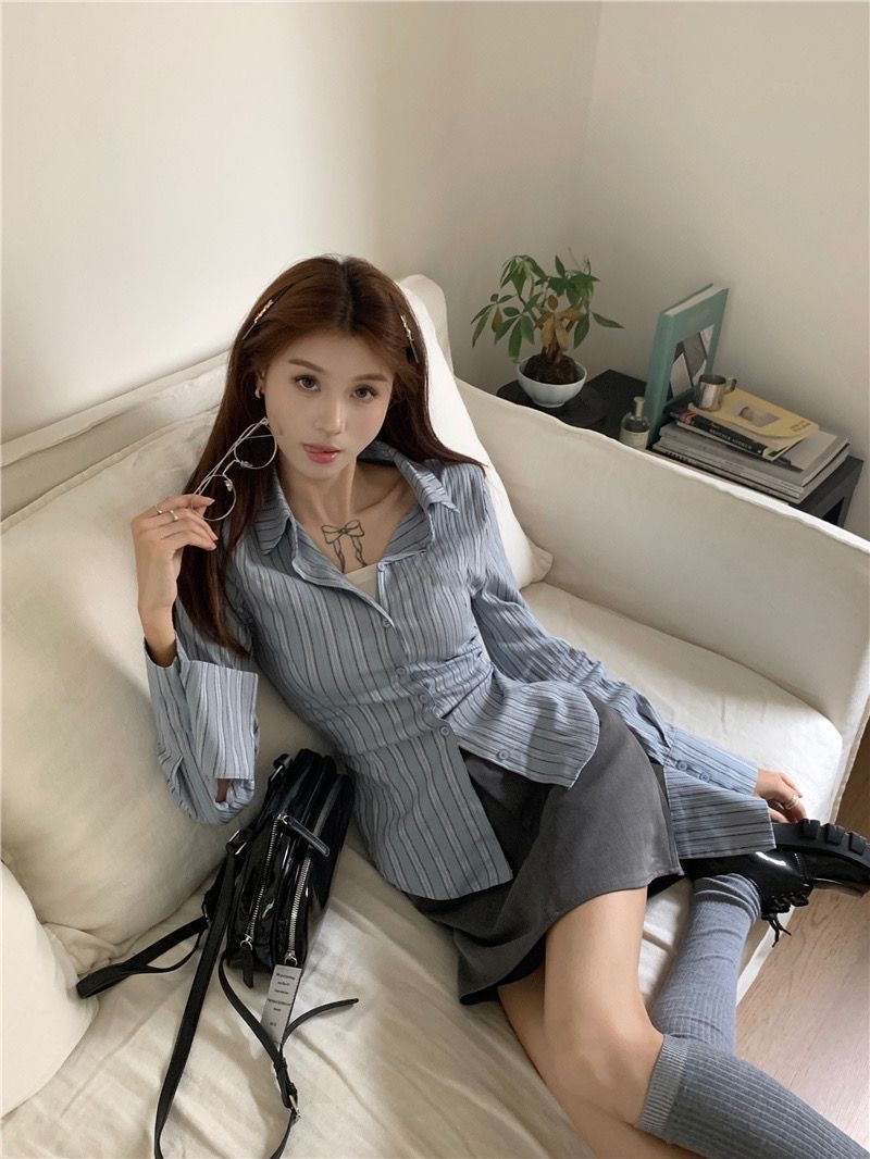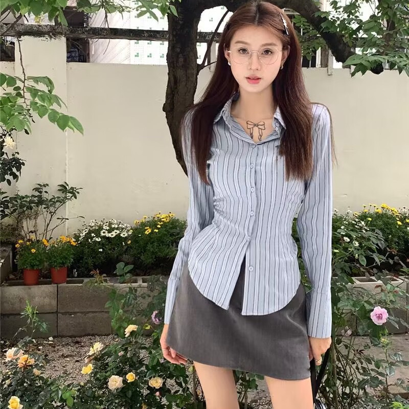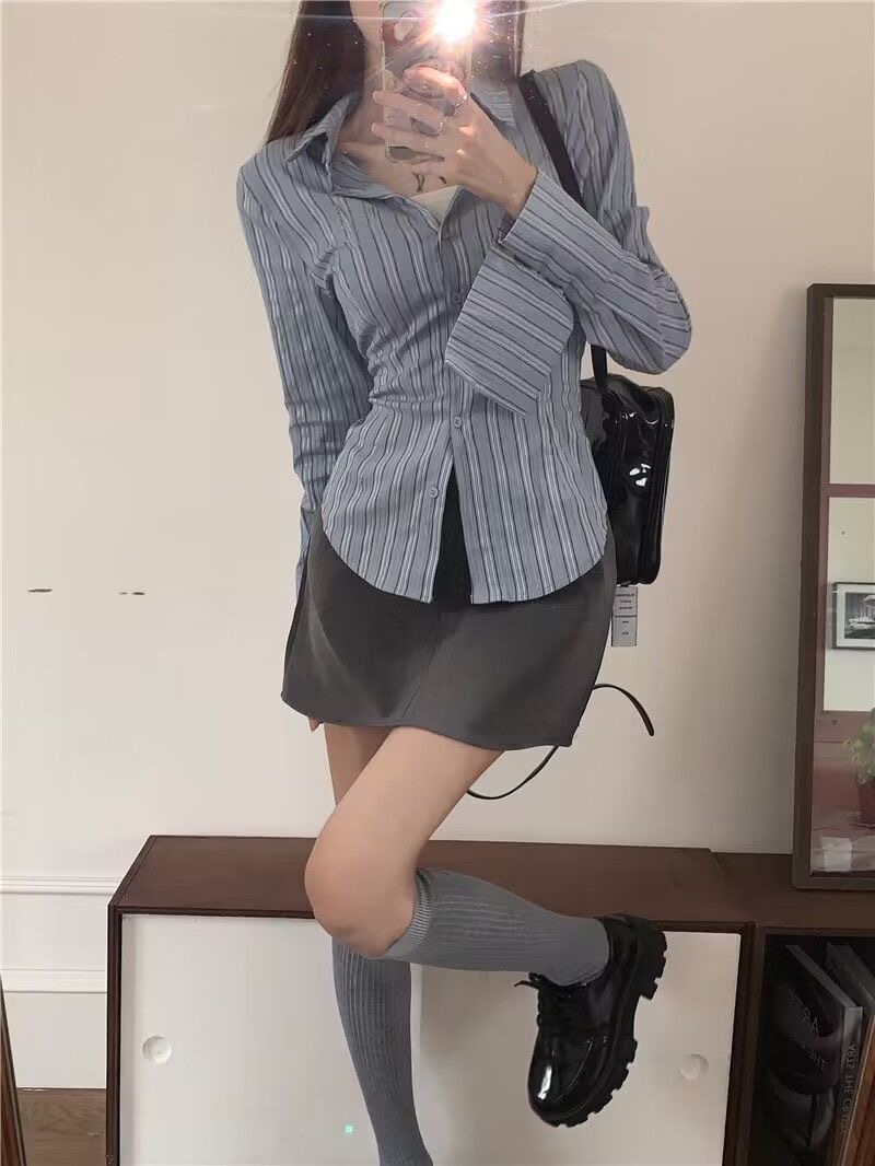 세트 여성의 2023 봄 새로운 디자인 센스 틈새 스트라이프 슬림 핏 타이트 허리 셔츠 그레이 스커트 투피스 세트스토어 가기
