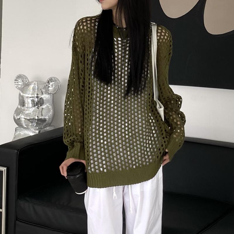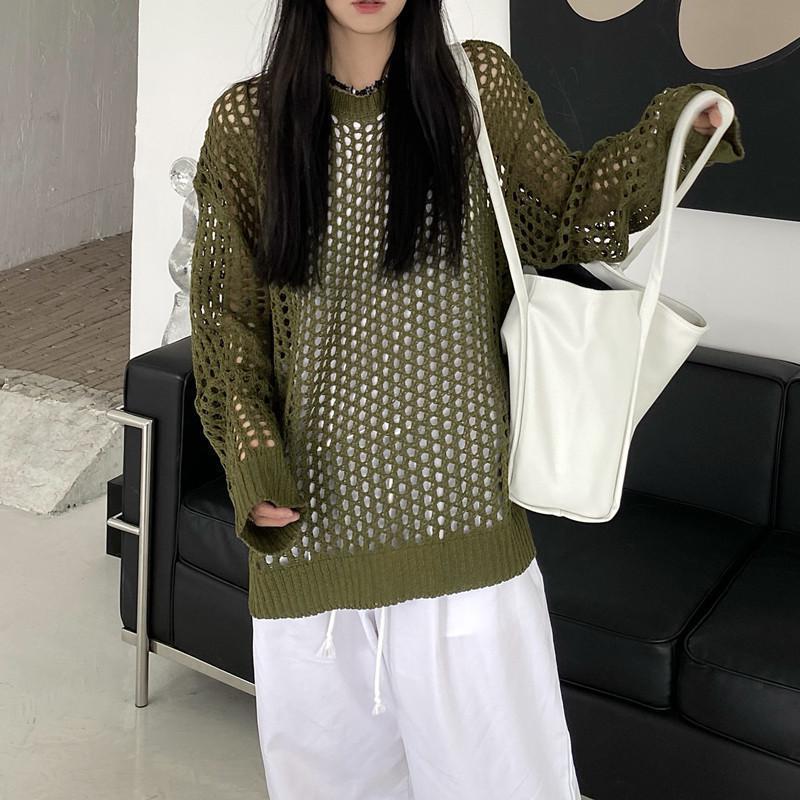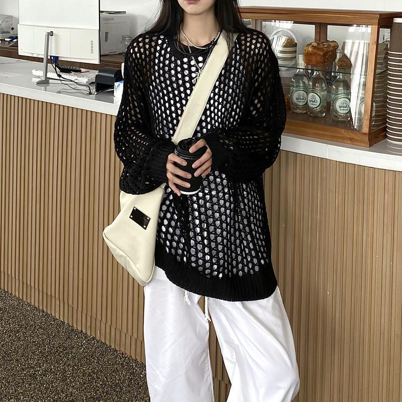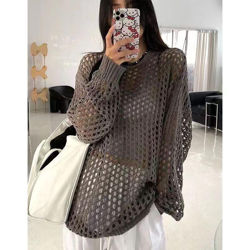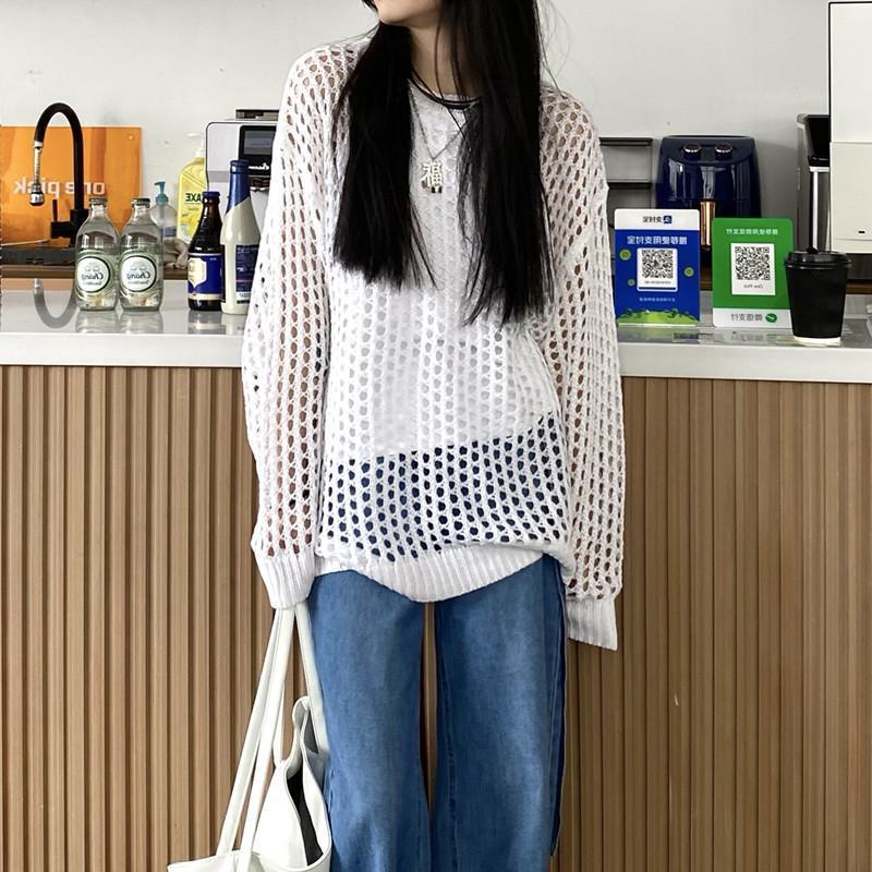 니트 할로우 아웃 선 스크린 니트 스웨터 여성의 여름 얇은 느슨한 디자인 틈새 크루 넥 드랩 긴 소매 블라우스 탑스토어 가기