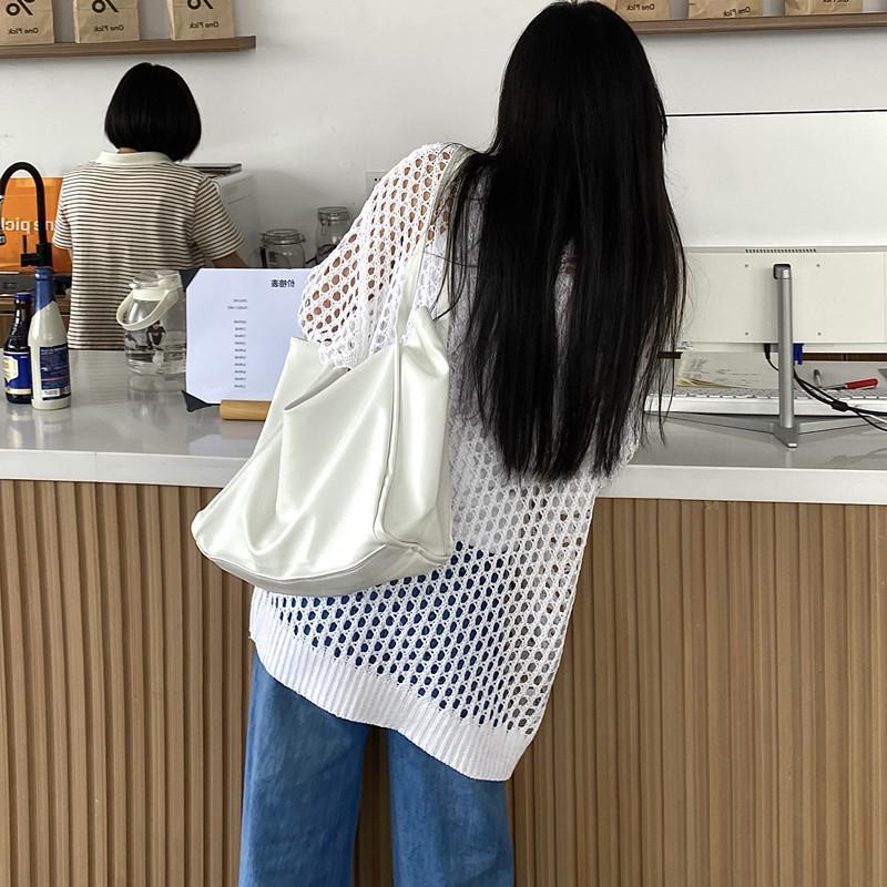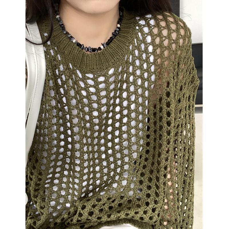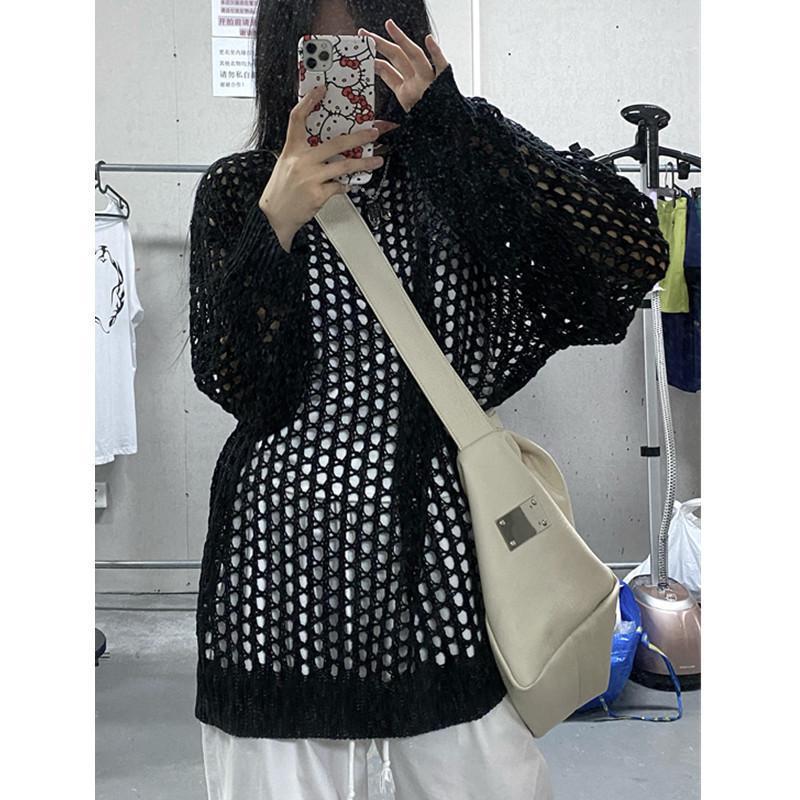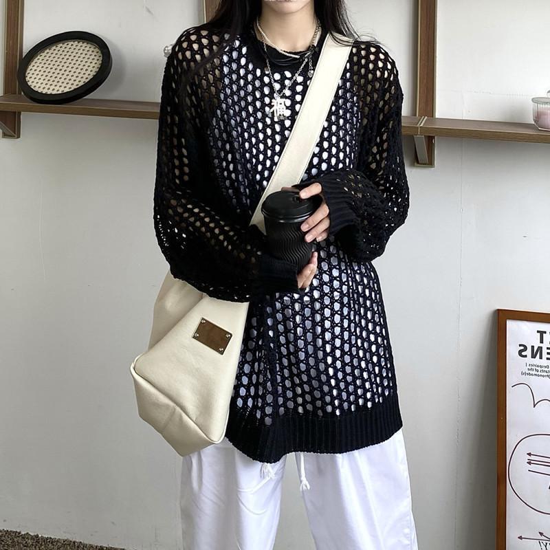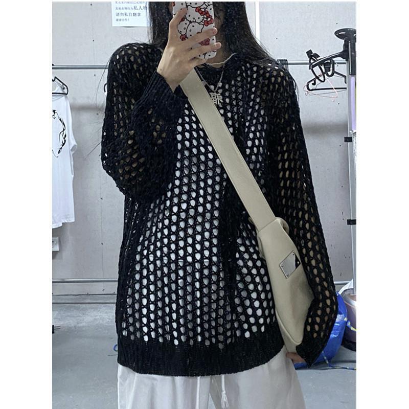 니트 할로우 아웃 선 스크린 니트 스웨터 여성의 여름 얇은 느슨한 디자인 틈새 크루 넥 드랩 긴 소매 블라우스 탑스토어 가기