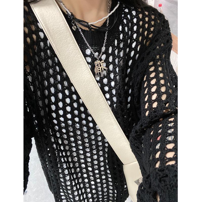 니트 할로우 아웃 선 스크린 니트 스웨터 여성의 여름 얇은 느슨한 디자인 틈새 크루 넥 드랩 긴 소매 블라우스 탑