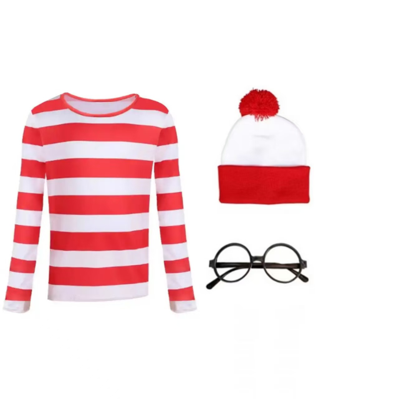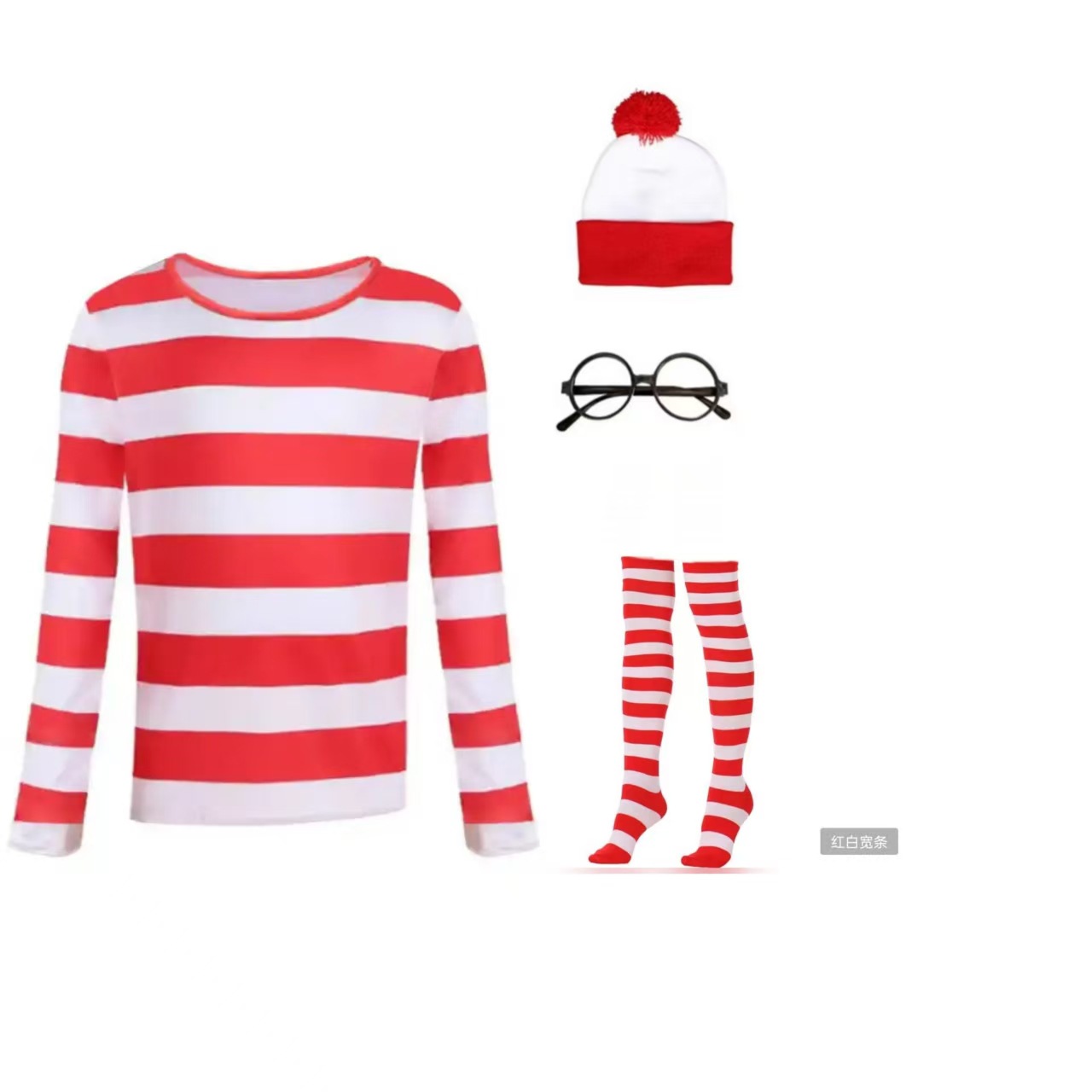 스마트 월리 월리의 곳은 영국 애니메이션 캐릭터 코스프레 의상입니다. 할로윈 칼라에는 빨간색 스트립이 있습니다.스토어 가기