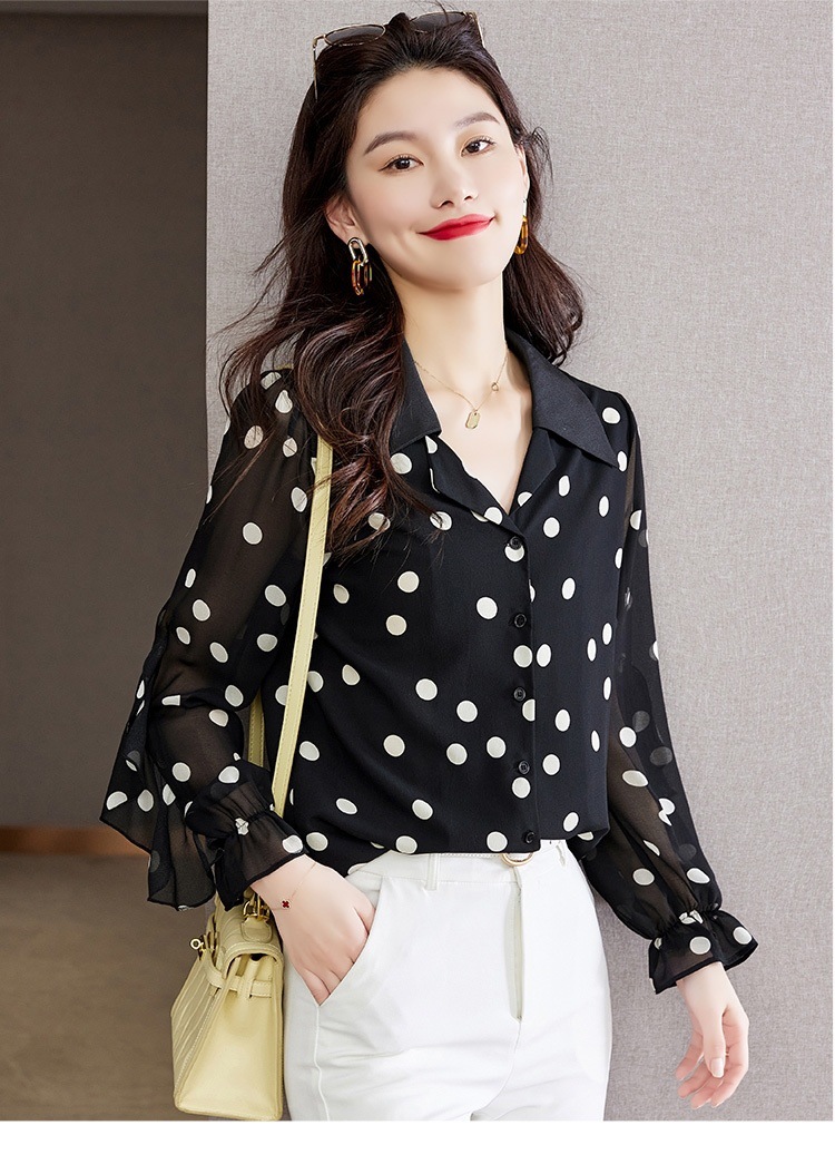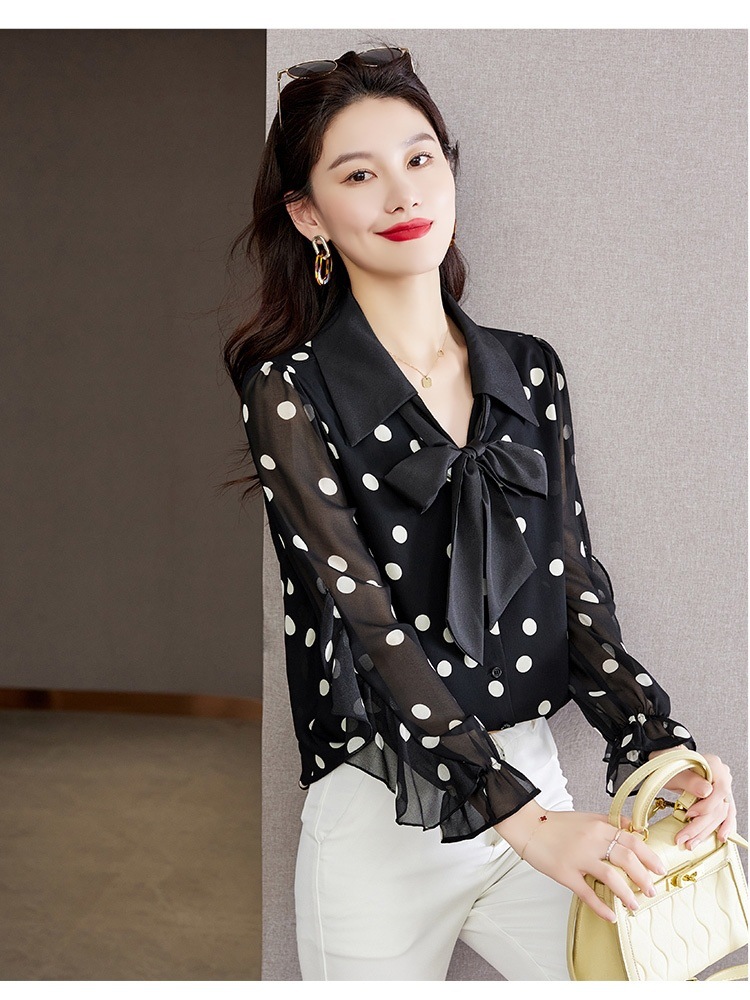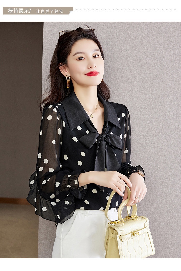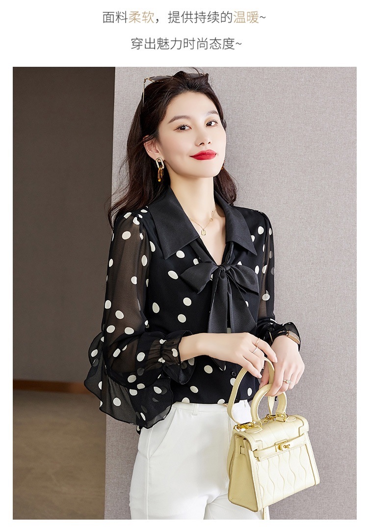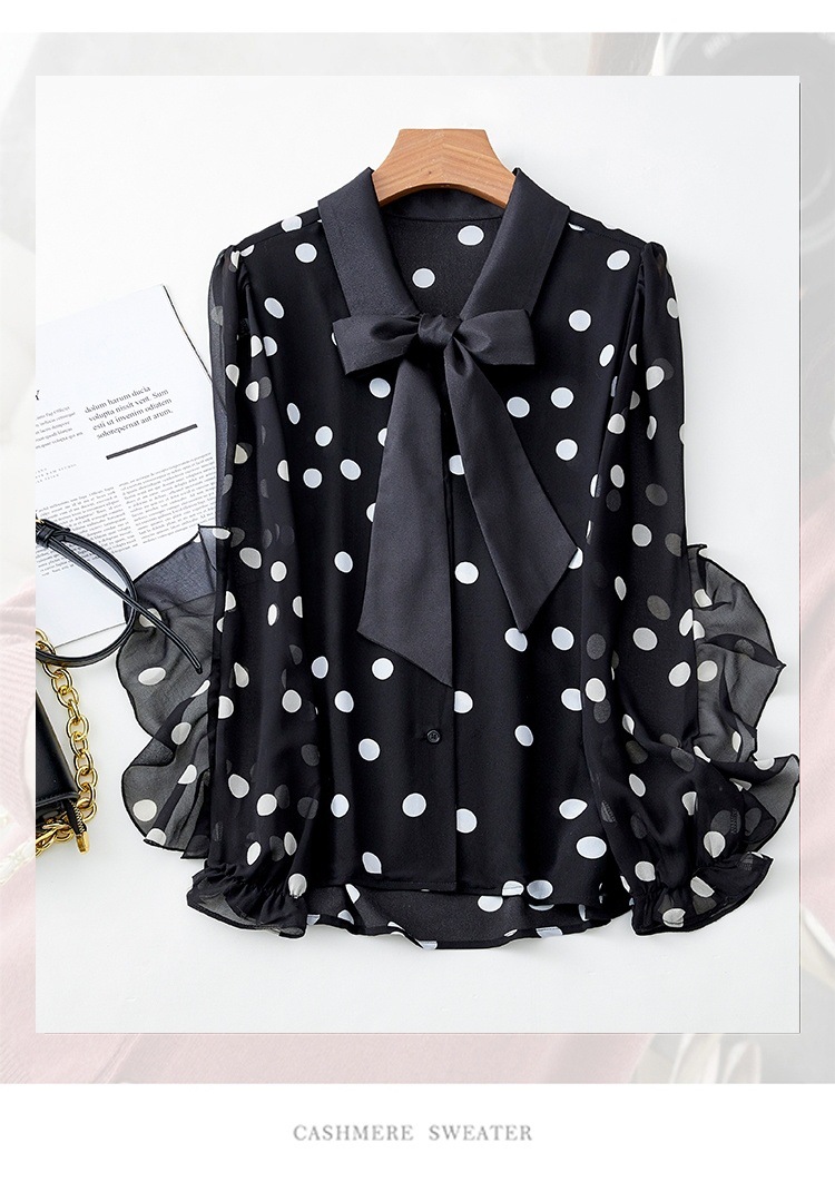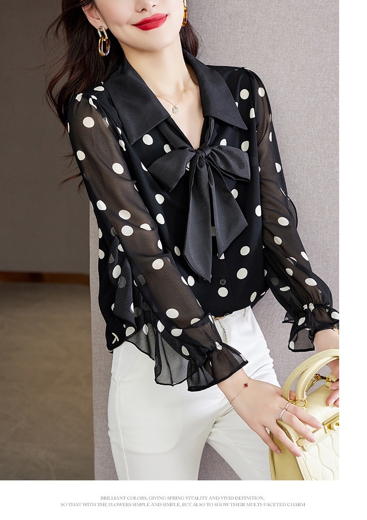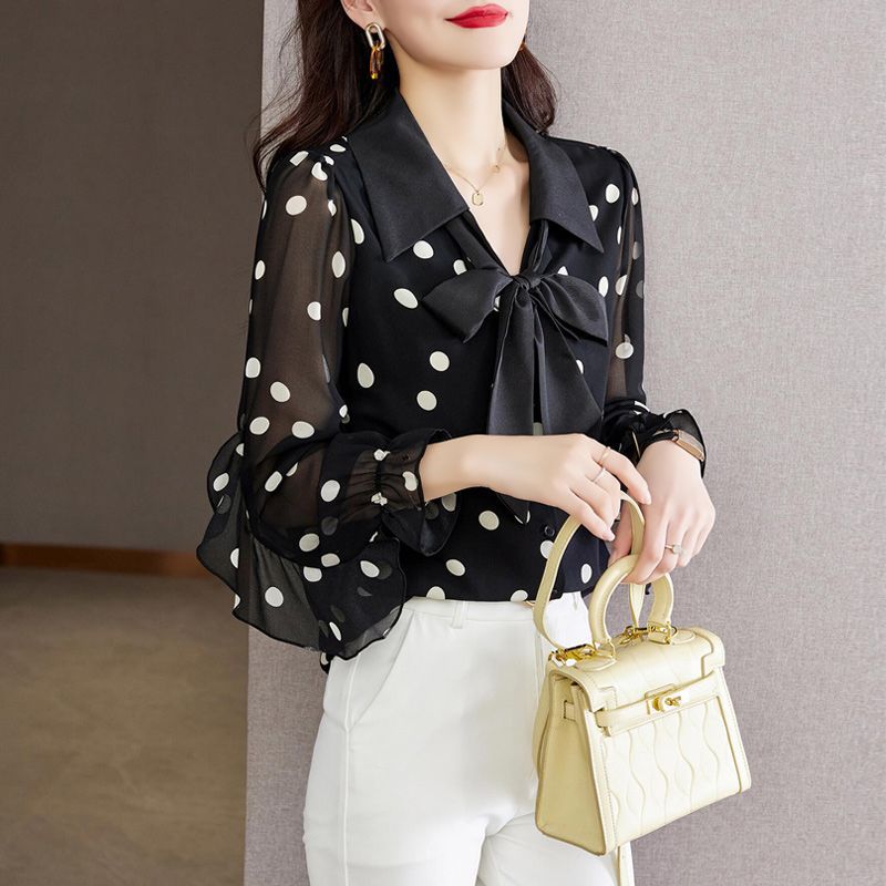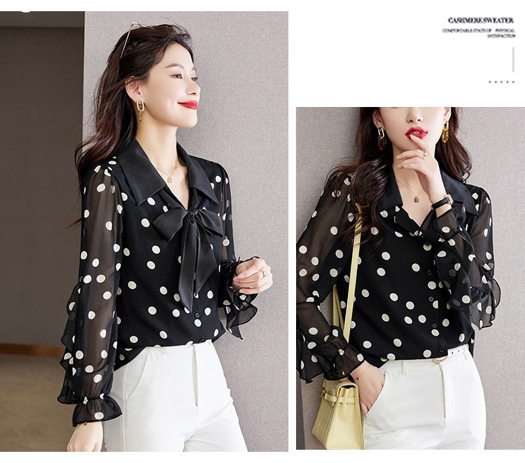 폴카 도트 셔츠 여성용 2023 봄 여름 신상품 세련된 아름다운 배꼽 덮는 쉬폰 셔츠 러플 셔츠 여성용 시크한 스몰 셔츠스토어 가기
