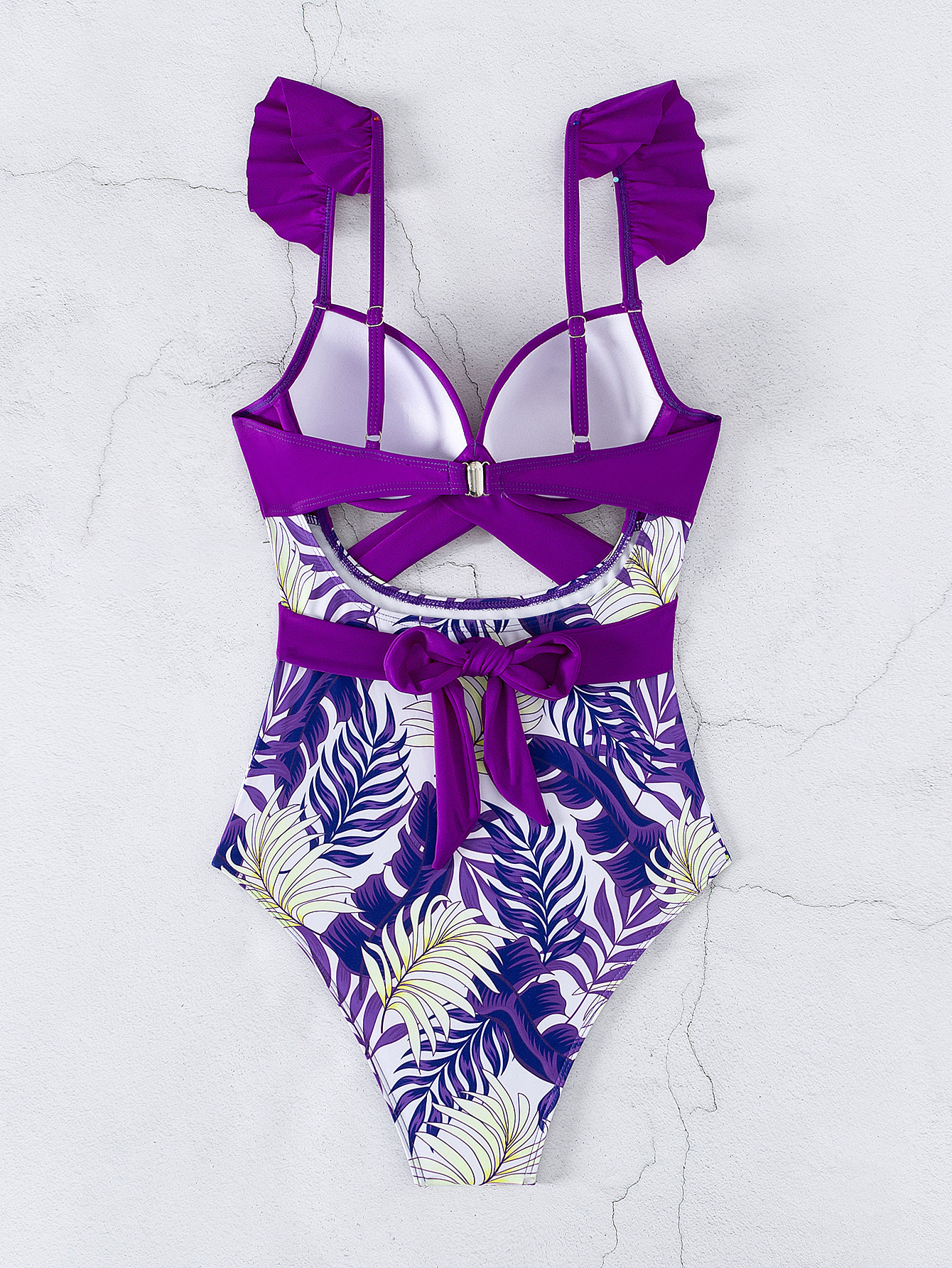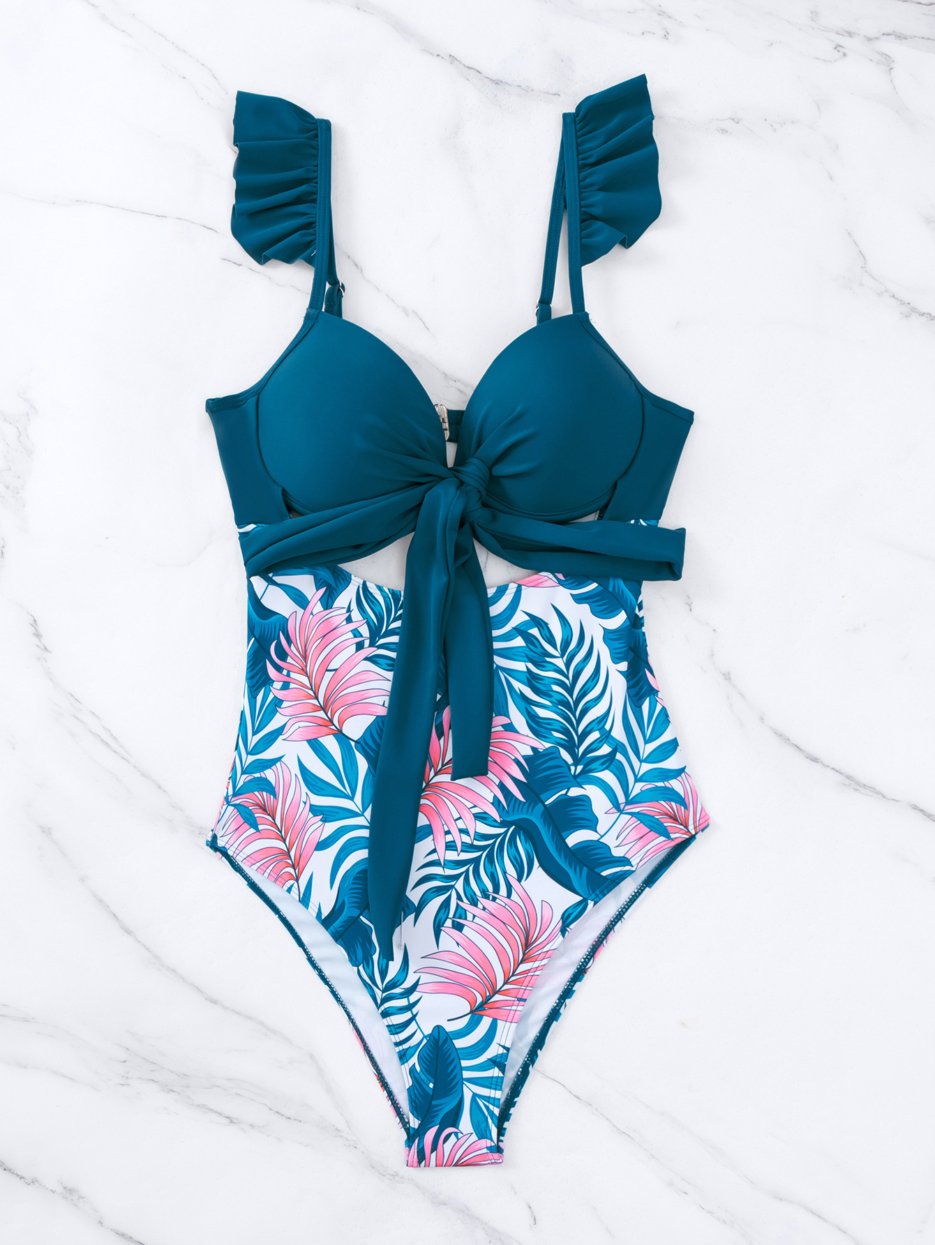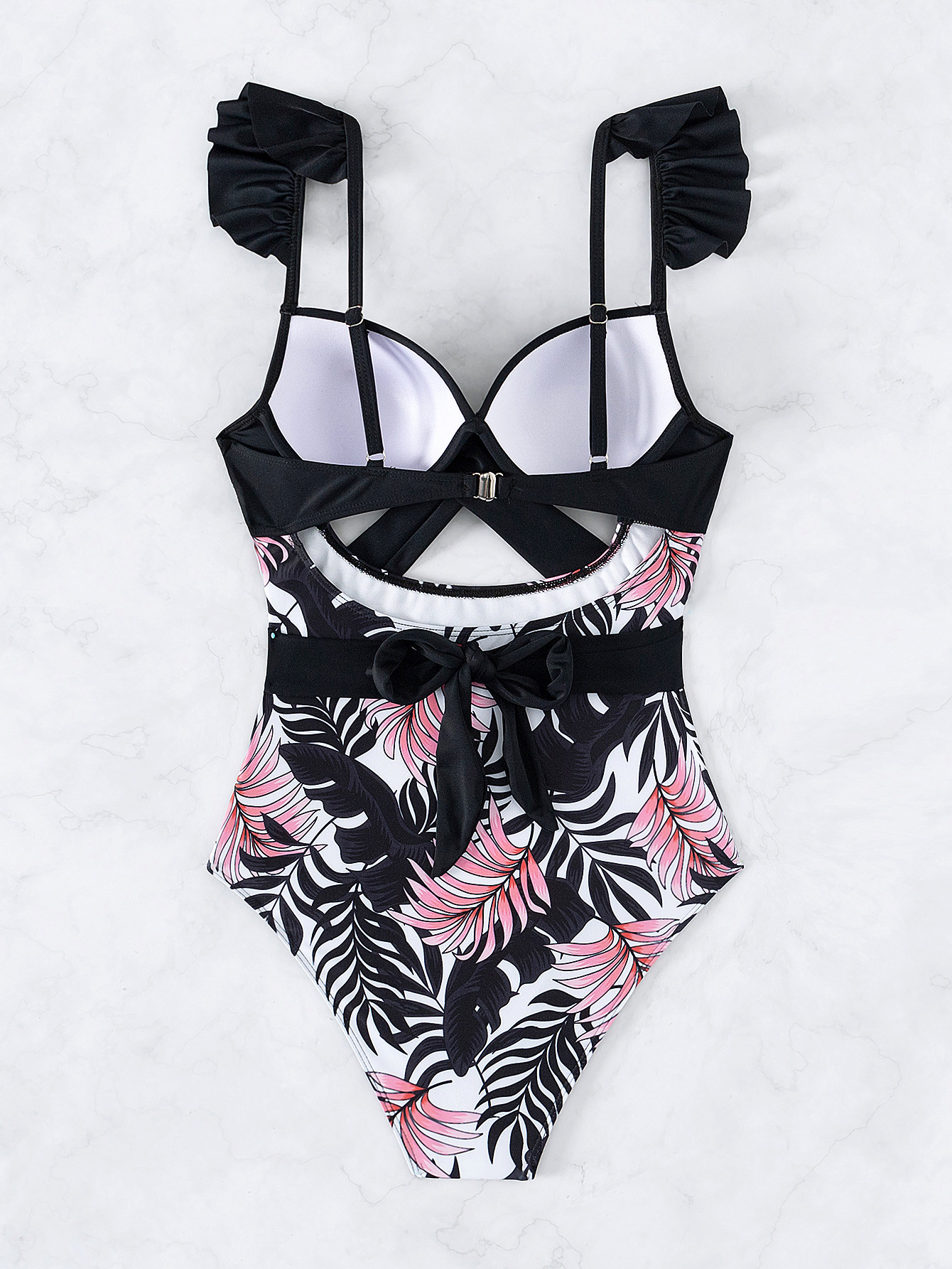 2025 새로운 유럽과 미국의 대외 무역 인쇄 패션 섹시한 비키니 원피스 프릴 레이스 업 백리스 수영복 여성용스토어 가기