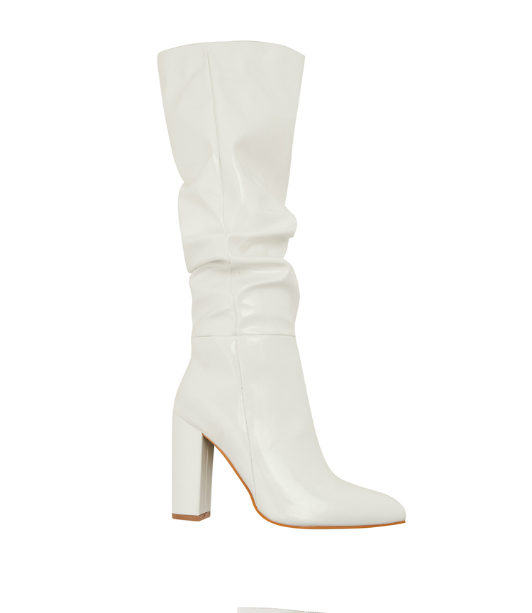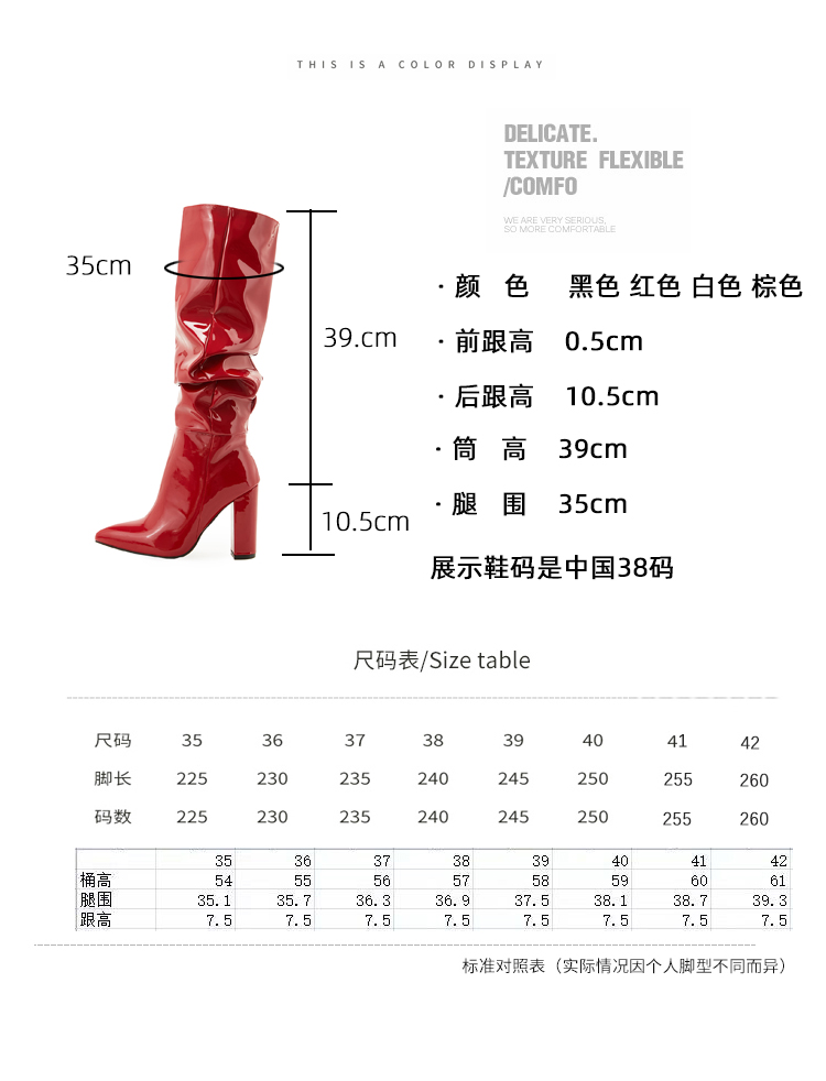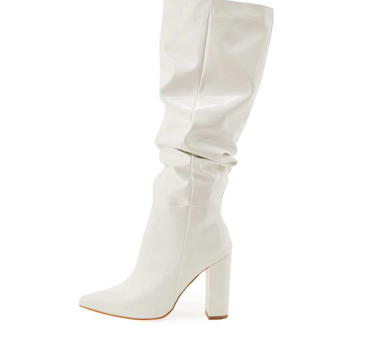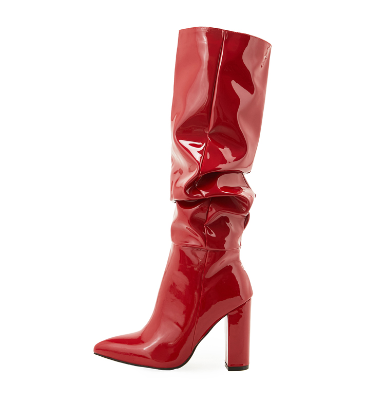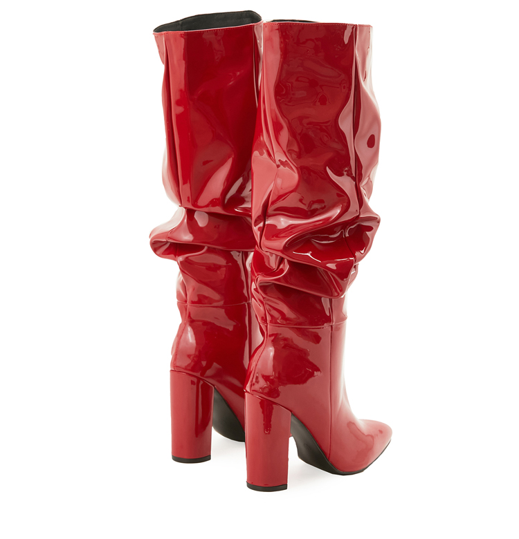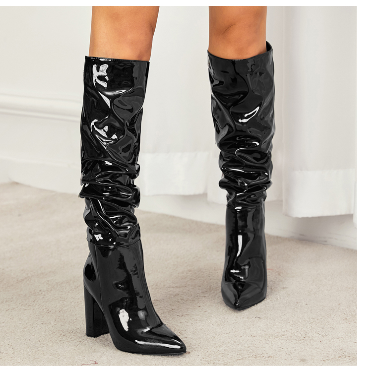 유럽과 미국 대외 무역 에나멜 가죽 미들 부츠 사이드 지퍼 뾰족한 두꺼운 굽 패션 주름 여성 부츠 여성 부츠스토어 가기