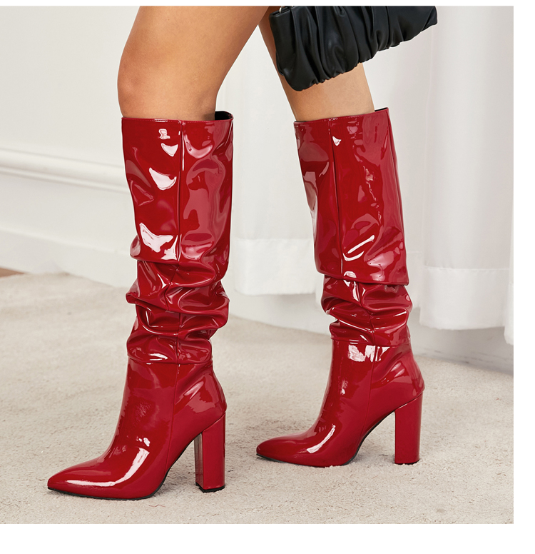 유럽과 미국 대외 무역 에나멜 가죽 미들 부츠 사이드 지퍼 뾰족한 두꺼운 굽 패션 주름 여성 부츠 여성 부츠
