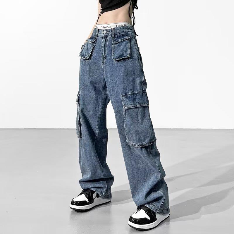 아메리칸 스타일 레트로 디자인 센스 포켓 청바지 여성의 봄 유행 하이 스트리트 틈새 스트레이트 레그 와이드 레그 작업 바지스토어 가기