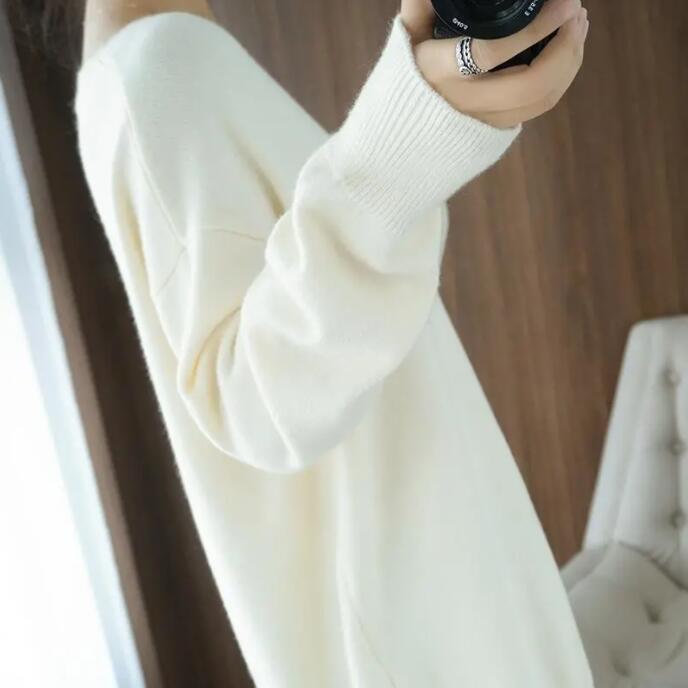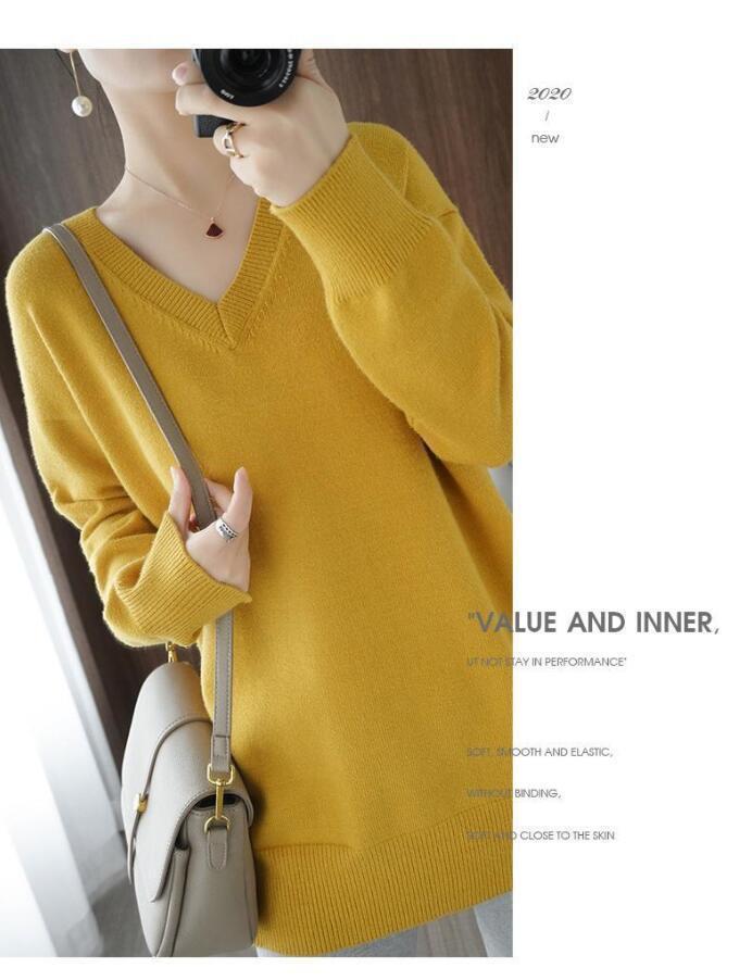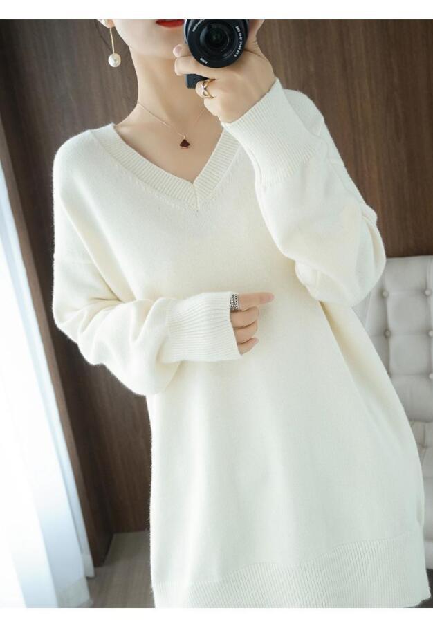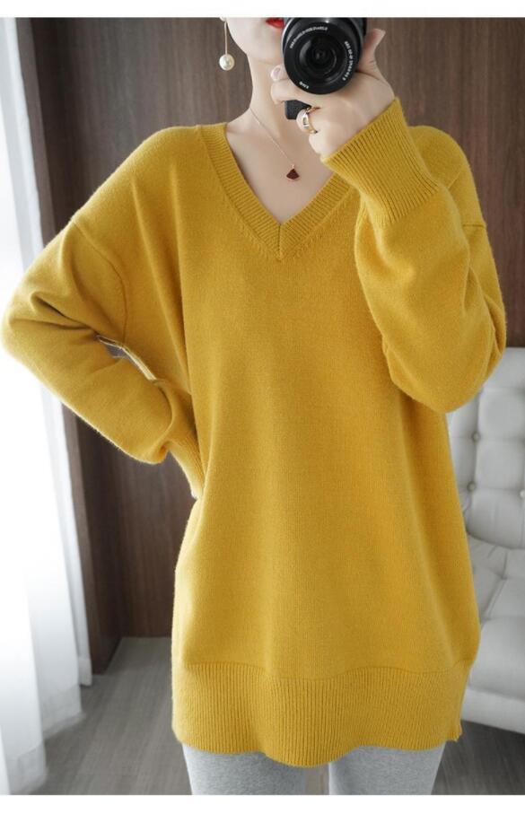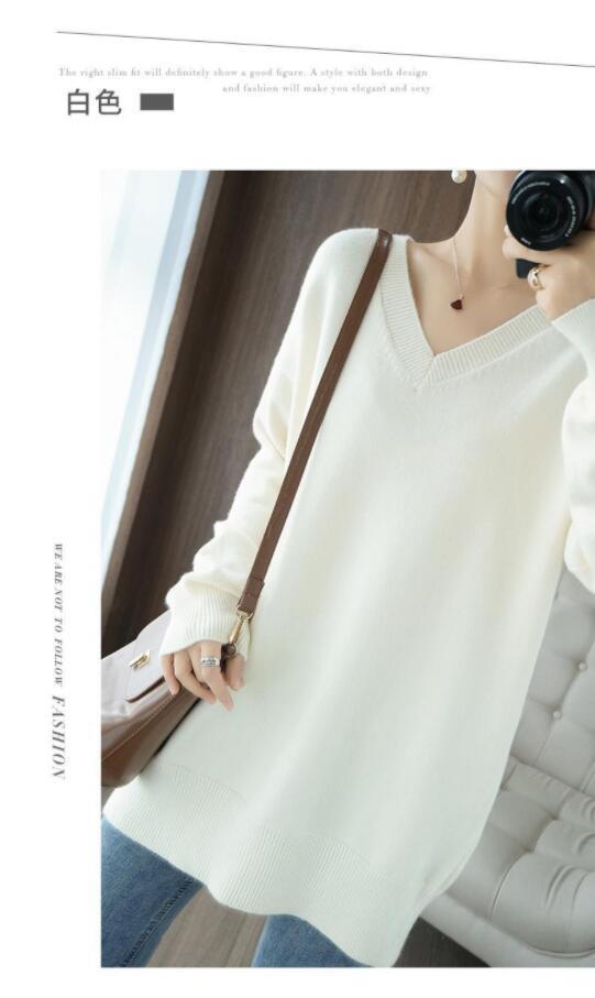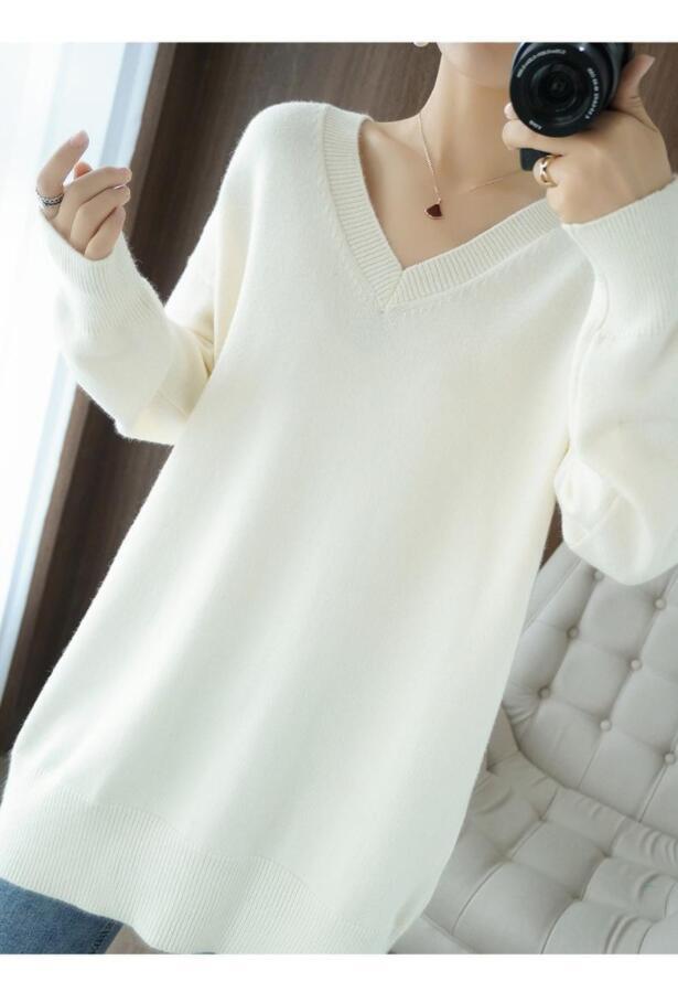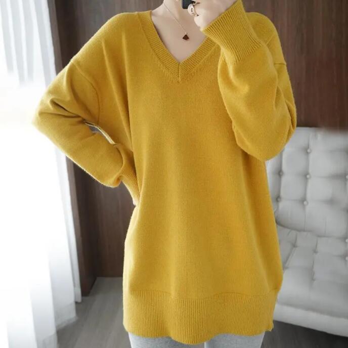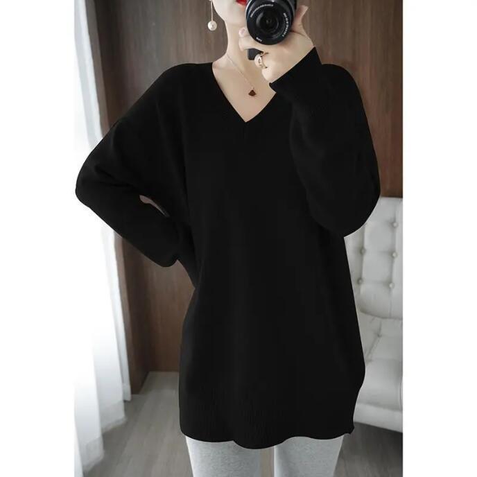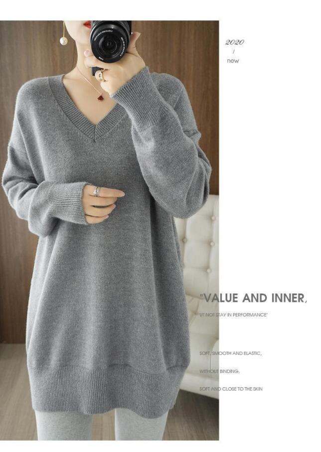 이른 가을 플러스 사이즈 중간 길이 스웨터 V-넥 느슨한 한국 단색 겉옷 가을과 겨울 여성을위한 새로운 니트 베이스 셔츠