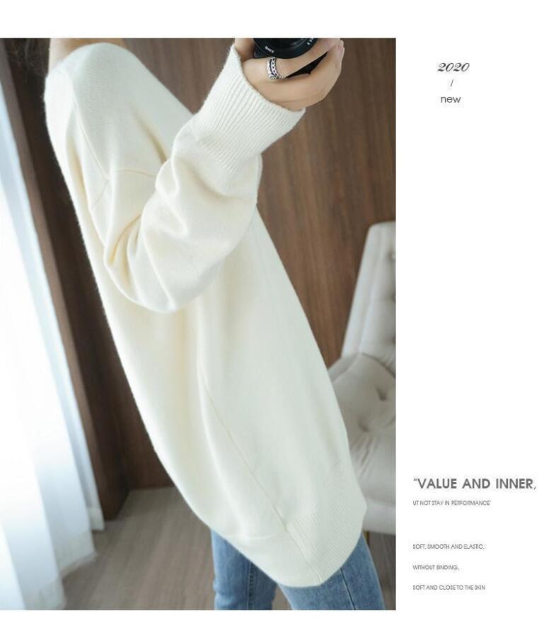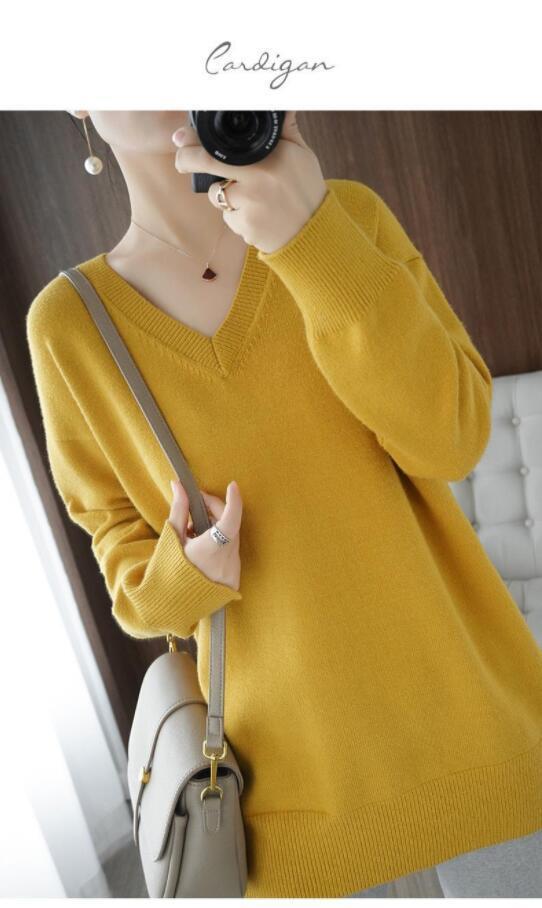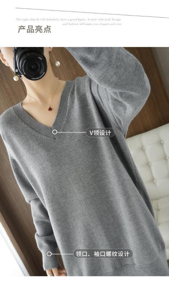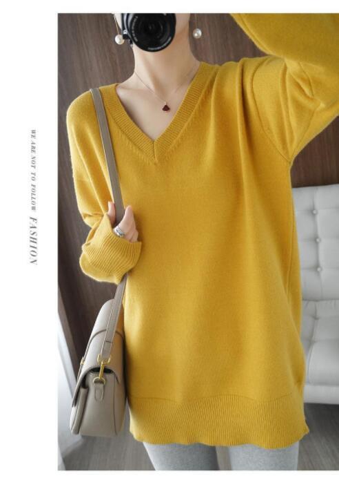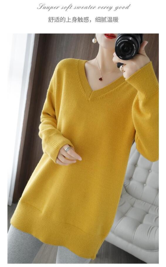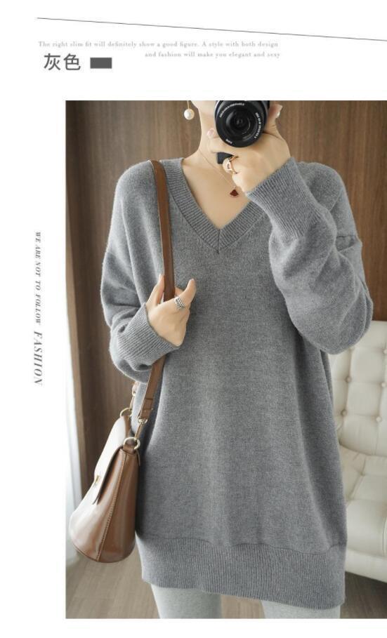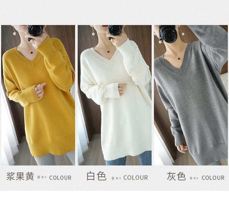 이른 가을 플러스 사이즈 중간 길이 스웨터 V-넥 느슨한 한국 단색 겉옷 가을과 겨울 여성을위한 새로운 니트 베이스 셔츠스토어 가기