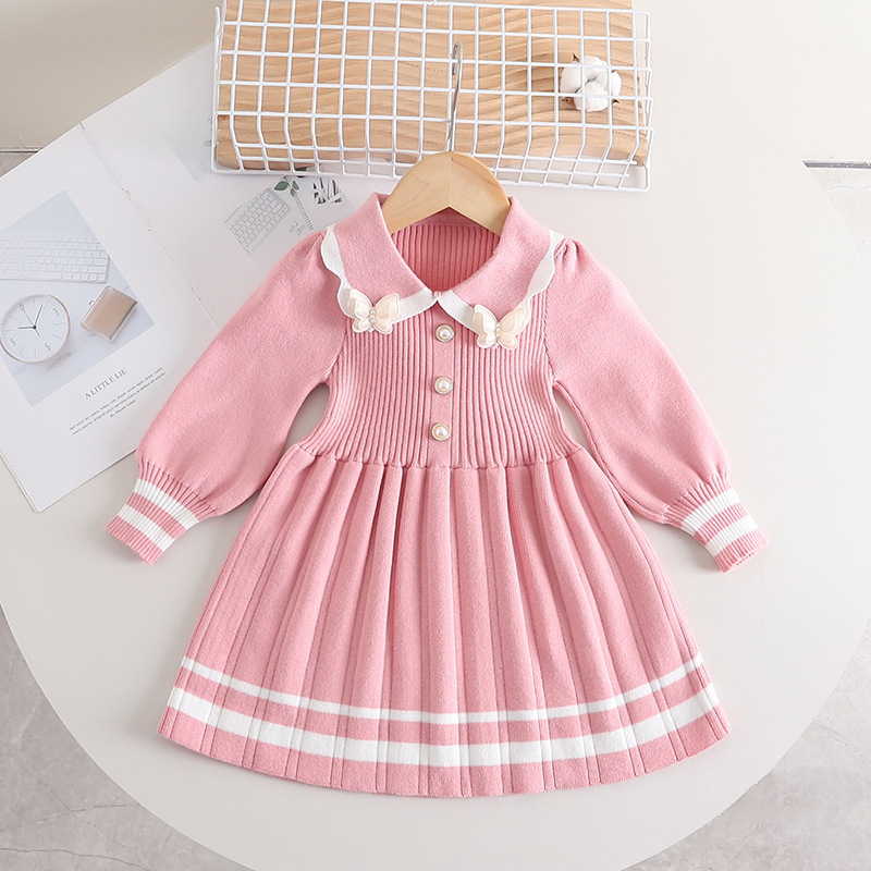 어린이 가을과 겨울 원피스 소녀의 새로운 캔디 컬러 반전 칼라 측면 꽃 스웨터 원피스 아기 소녀의 세련된스토어 가기