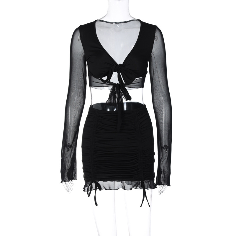유럽풍 2025 여름 크로스보더 여성복 신상 단색 브이넥 긴팔 패션 하이웨이스트 플리츠 스커트 세트스토어 가기