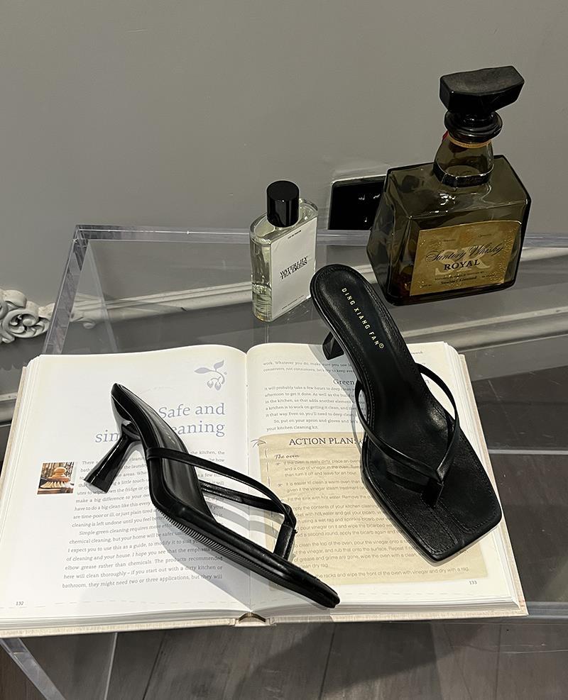 여름 2023 새로운 스타일 심플 헤링본 미드힐 샌들 패셔너블한 모든 경기 얇은 굽 스퀘어 토 아웃웨어 슬리퍼