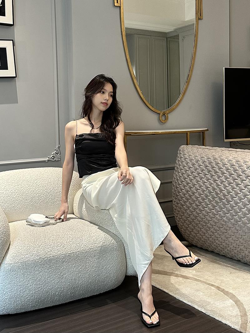 여름 2023 새로운 스타일 심플 헤링본 미드힐 샌들 패셔너블한 모든 경기 얇은 굽 스퀘어 토 아웃웨어 슬리퍼스토어 가기