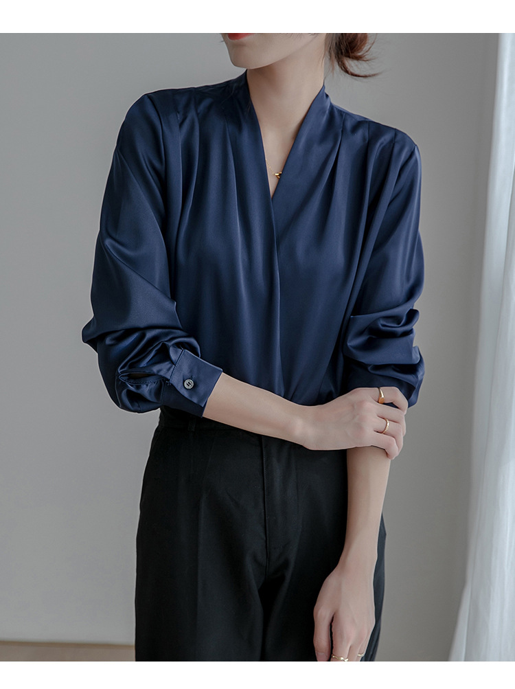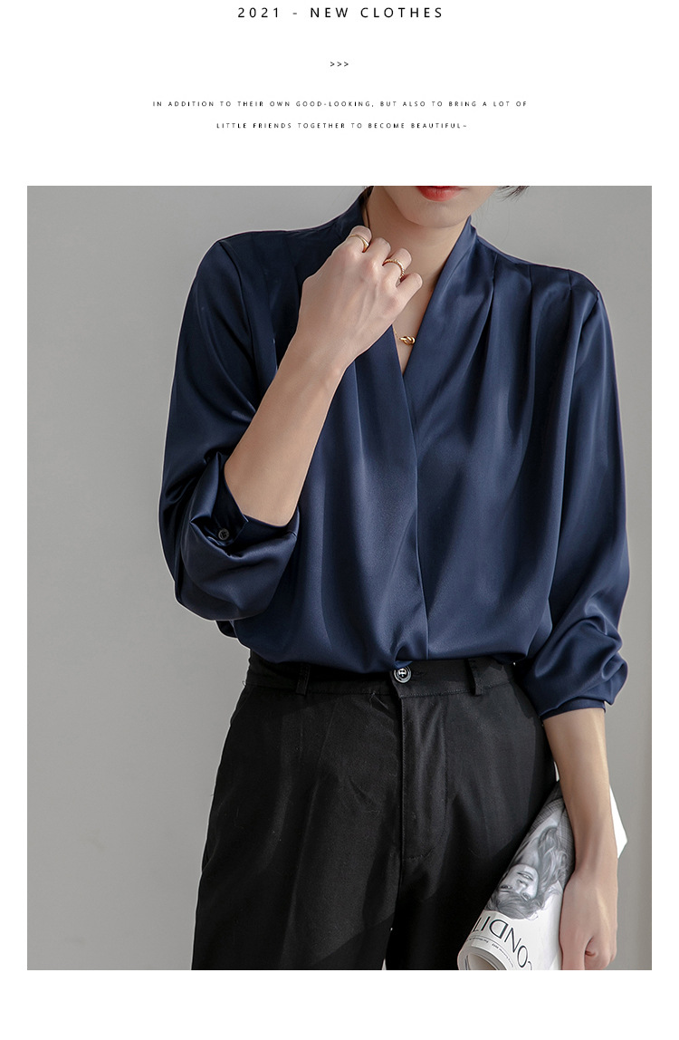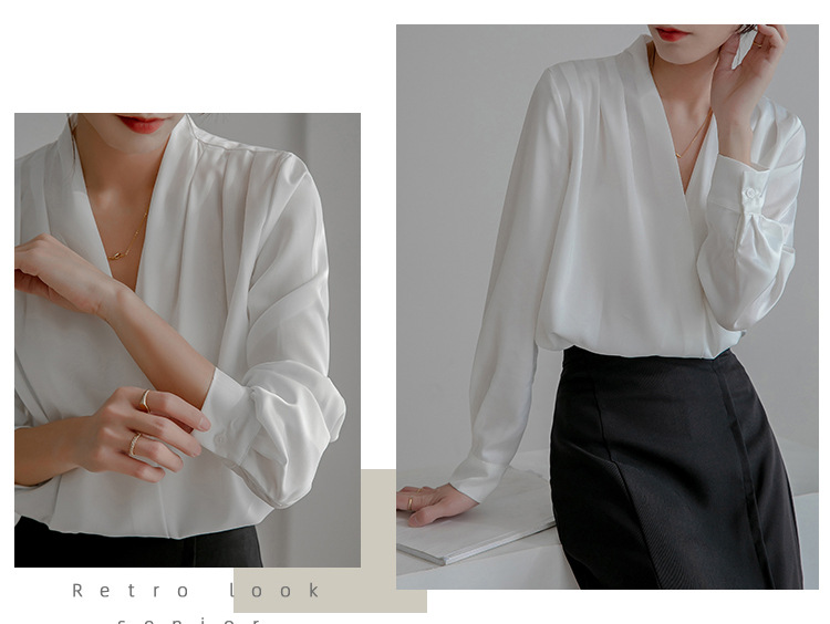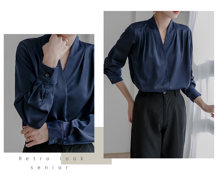 여성용 전문적인 새틴 긴팔 셔츠 2025 봄, 가을 광택 있는 프렌치 디자인 V넥 레트로 루즈 탑스토어 가기