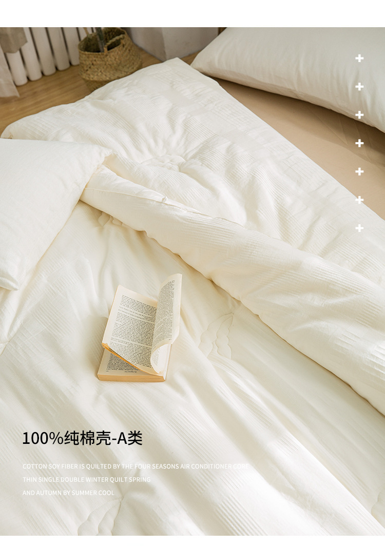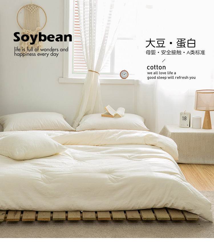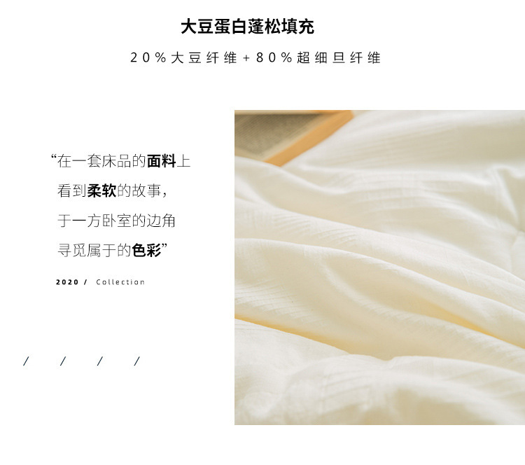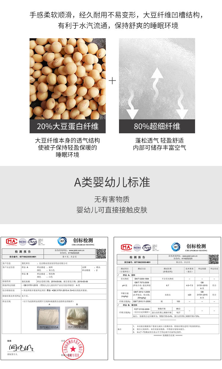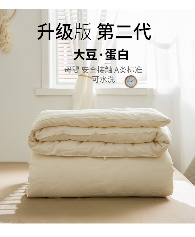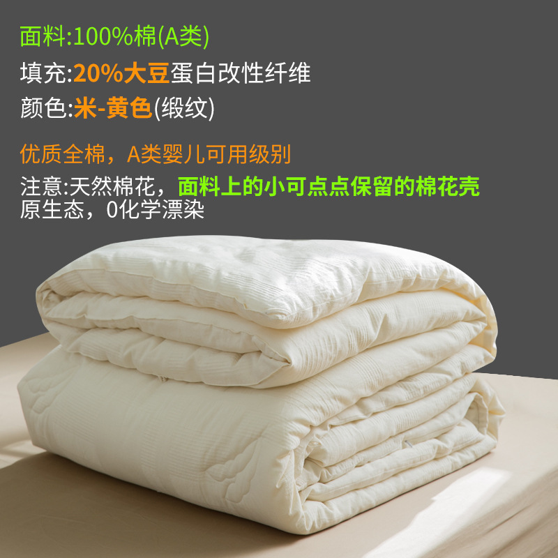 商品名称:A类全棉大豆被面料成分:A类!100%棉,40支小提花,无经漂染、不含甲醛、无芳香胺染料、无荧光增白剂婴幼儿可用安全产品商品工艺:小提花商品填充:20%蛋白改性聚乙烯醇(大豆单板纤维 +80%超细旦纤维 产品尺寸:夏被:1.5x2.0m(约2.2斤)/2.0x2.3m(约3.8斤)/2.2x2.4m(约4.8斤)春秋被:1.5x2.0(约3.6斤)/2.0x2.3(约5.4斤)/2.2x2.4(约6.8斤) 冬被:1.5x2.0(约5.4斤)/2.0x2.3(约6.8斤)2.2x2.4(约8.6斤) 提醒:夏被可清洗 冬被不可洗