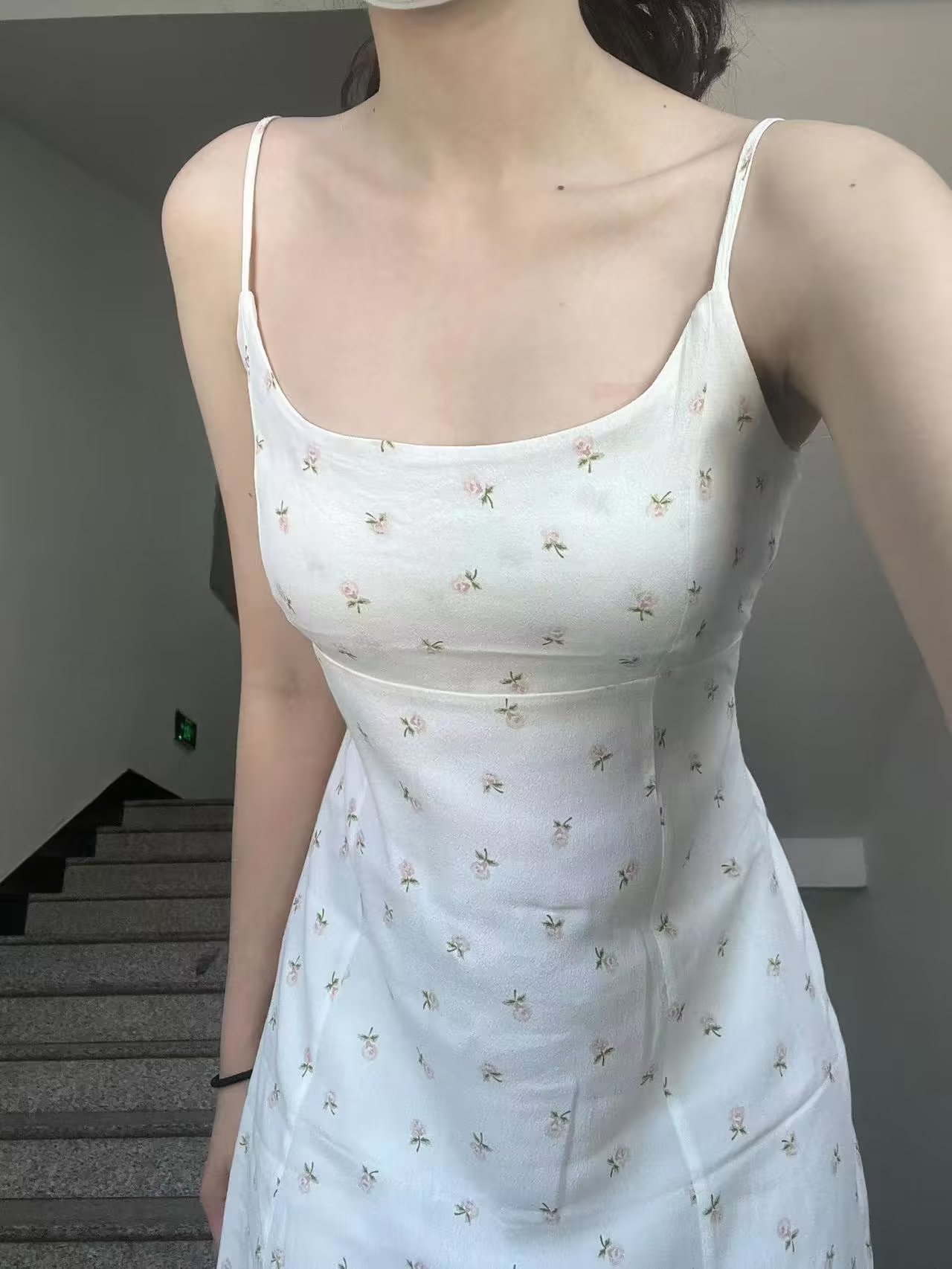 BM 스타일 프랑스 쉬폰 화이트 그라운드 크러쉬 플라워 스트랩 허리 스트랩 원피스 BM 달콤한 하이 웨이스트 슬림 여성의 긴 원피스