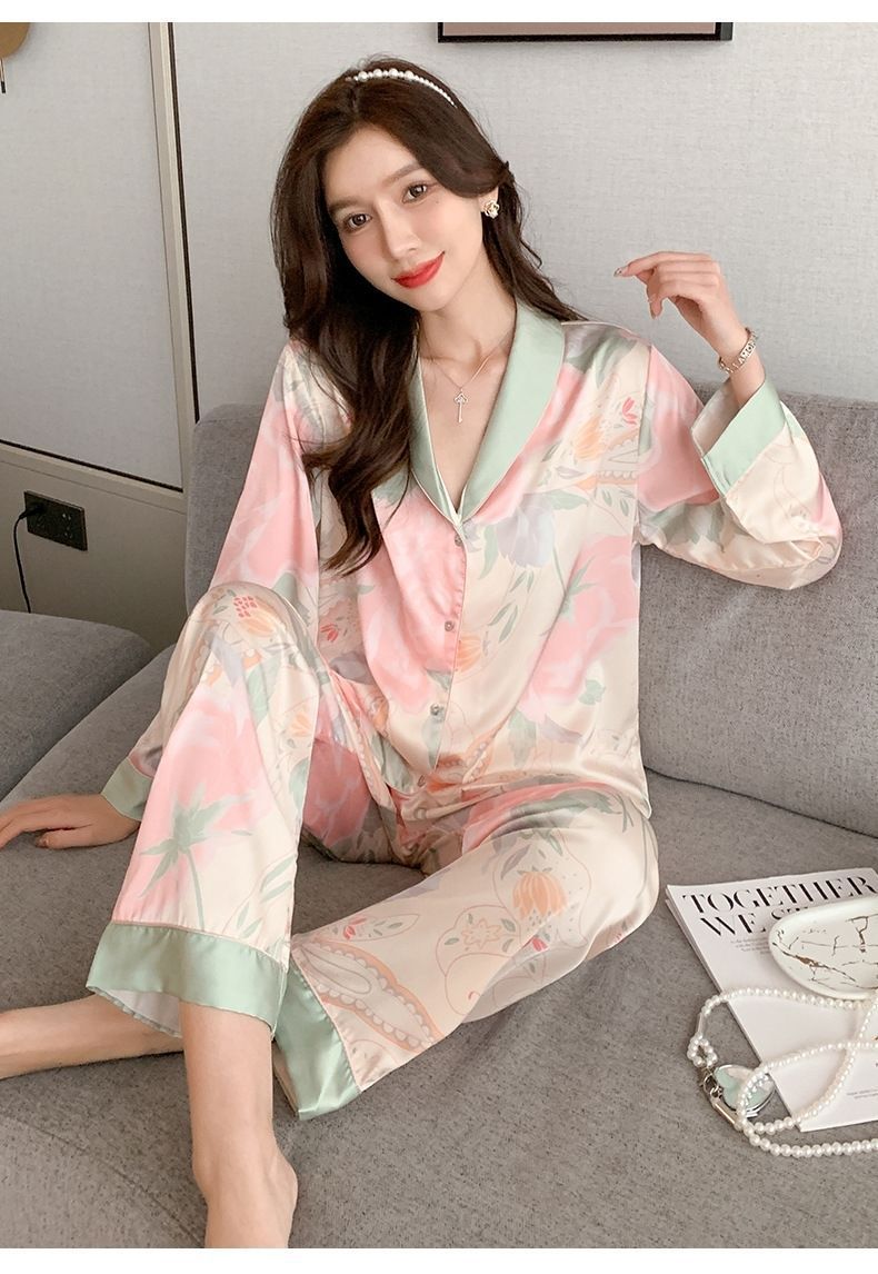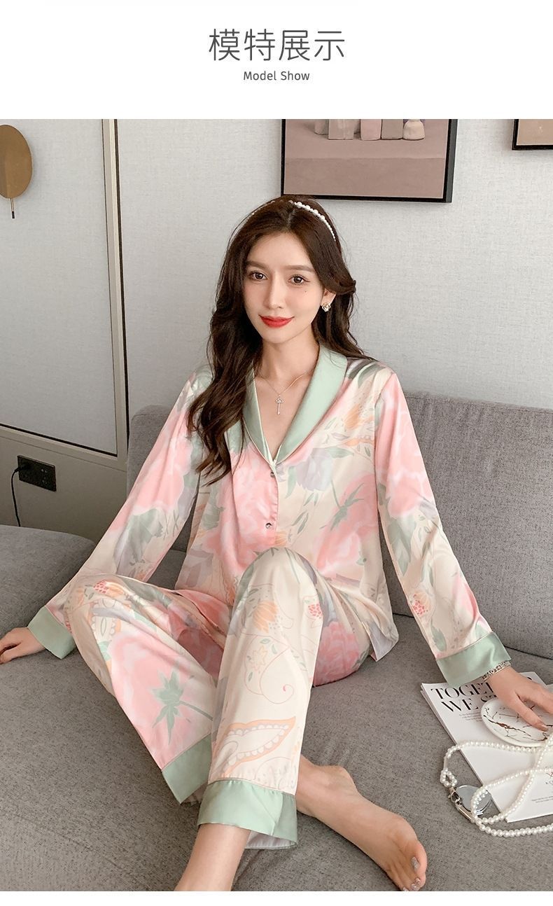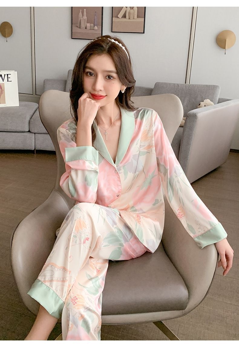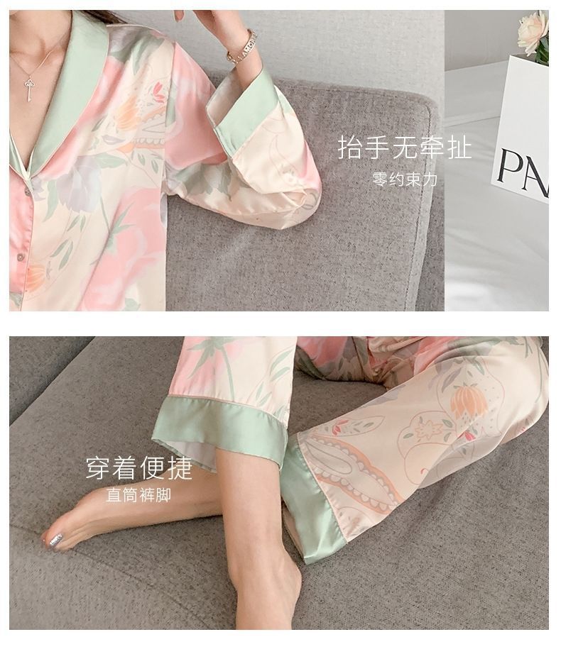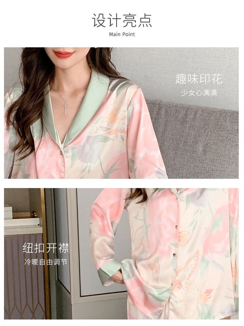 잠옷 여자의 봄과 가을 고급 실크 녹색 과일 칼라 신선한 꽃 우아한 세트 실크 얇은 새틴 가정 옷