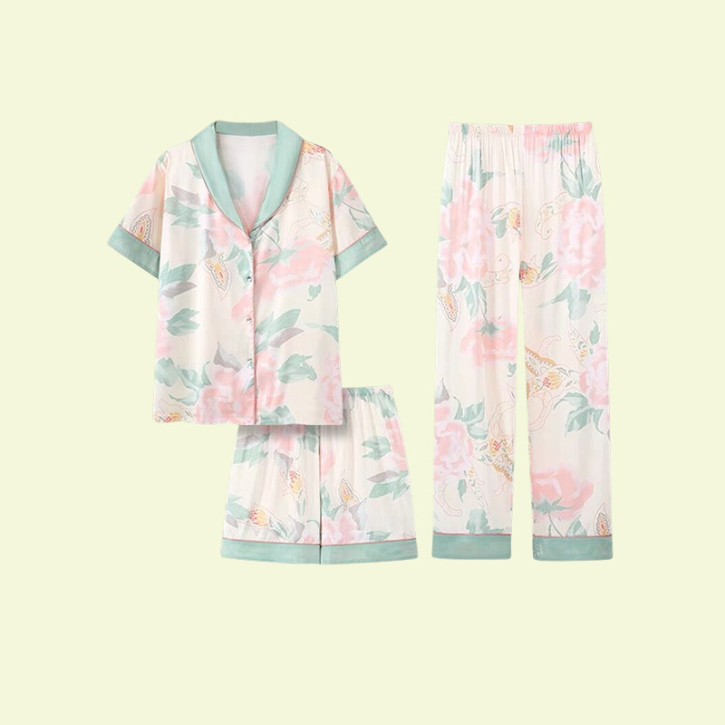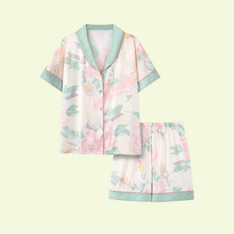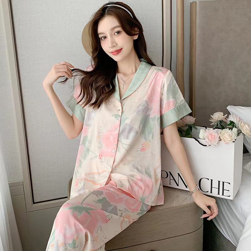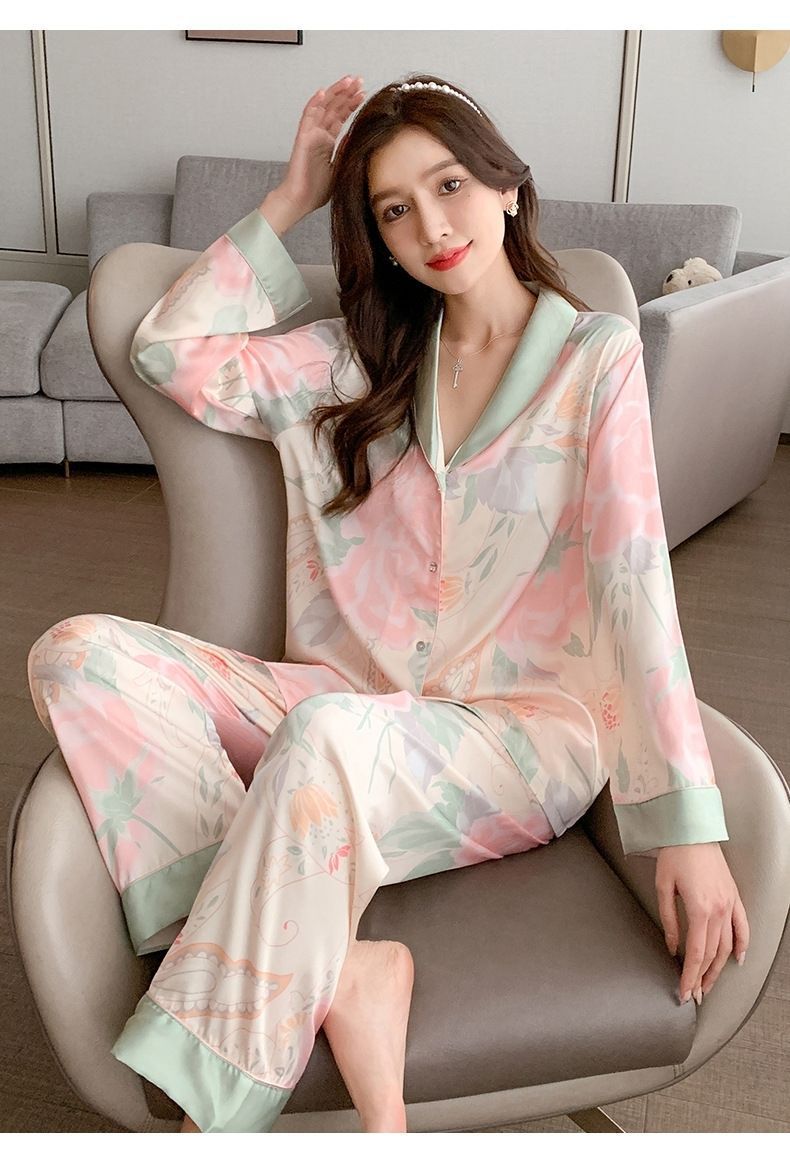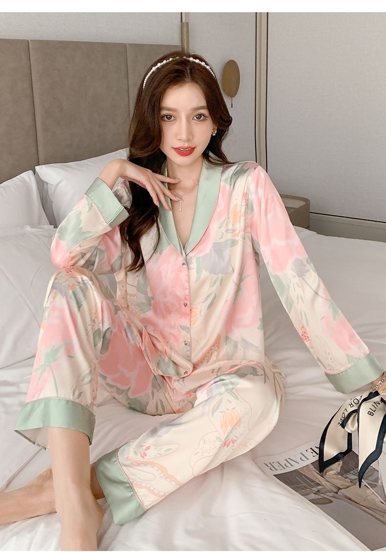 잠옷 여자의 봄과 가을 고급 실크 녹색 과일 칼라 신선한 꽃 우아한 세트 실크 얇은 새틴 가정 옷