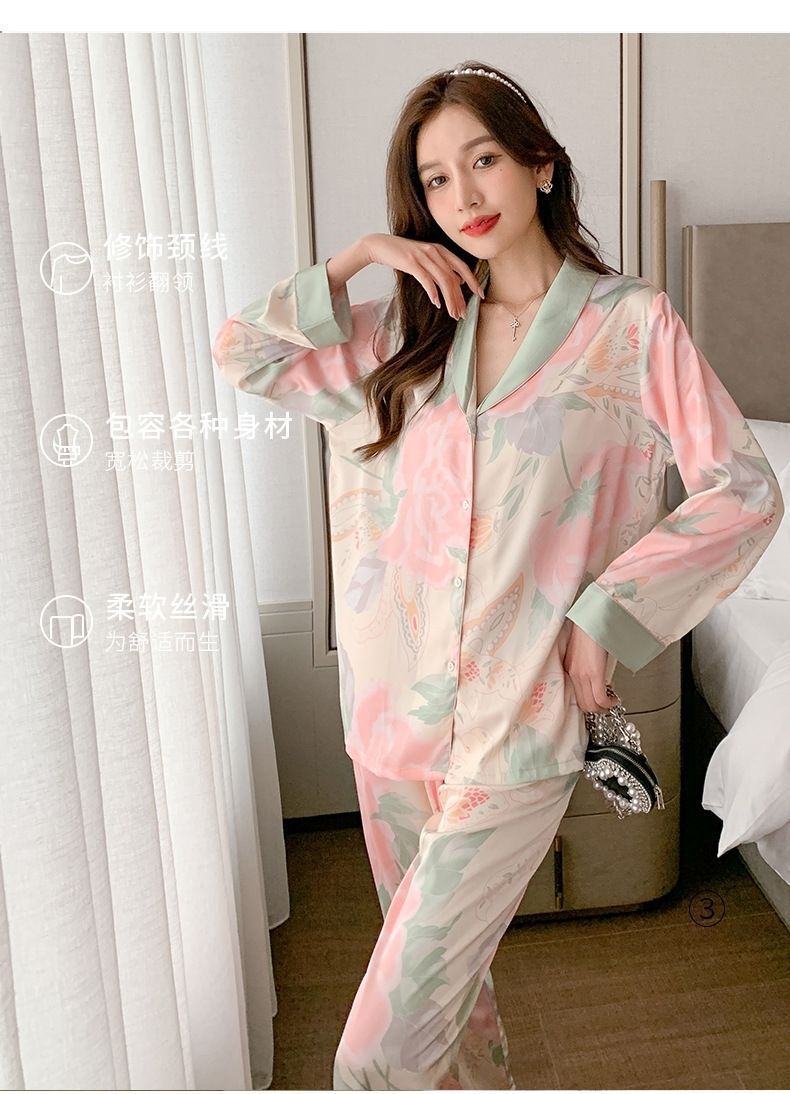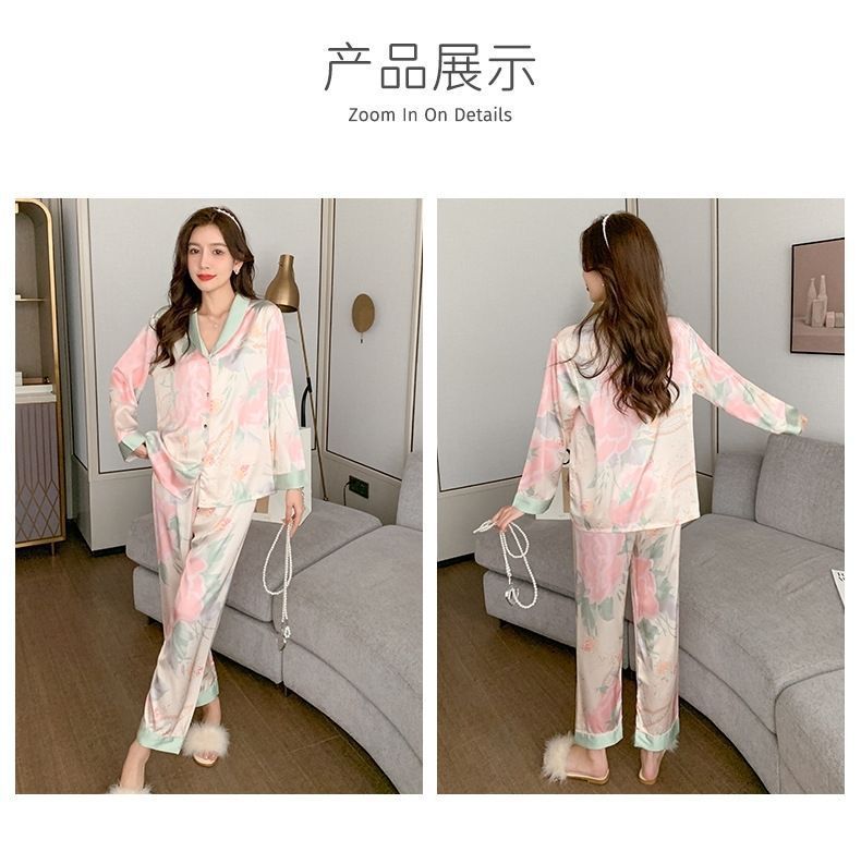 잠옷 여자의 봄과 가을 고급 실크 녹색 과일 칼라 신선한 꽃 우아한 세트 실크 얇은 새틴 가정 옷스토어 가기