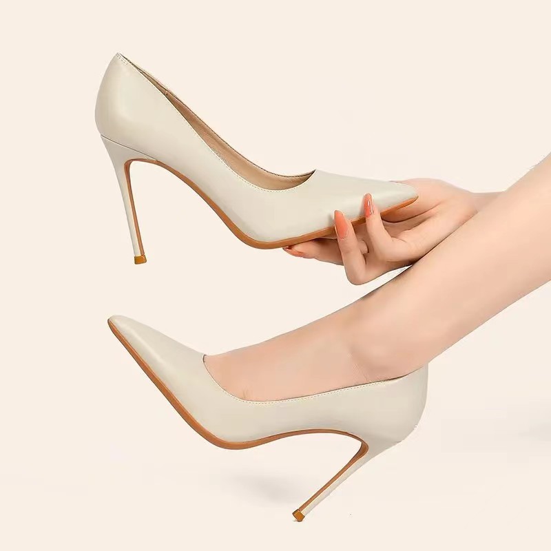 블랙 하이힐 여성용 스틸레토 가죽 2023 새로운 섹시한 우아한 누드 뾰족한 작업 신발 전문 싱글 신발스토어 가기