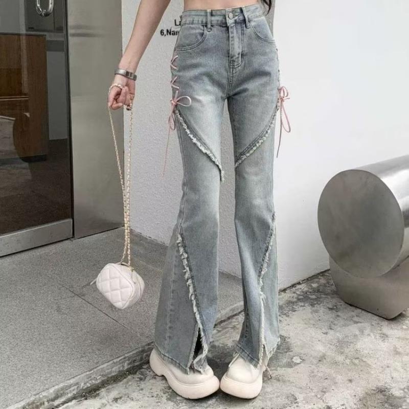 틈새 스트랩 마이크로 플레어 청바지 여성의 가을 새로운 스트레치 스플릿 핫 걸 슬림핏 하이 웨이스트 슬림 롱 팬츠스토어 가기
